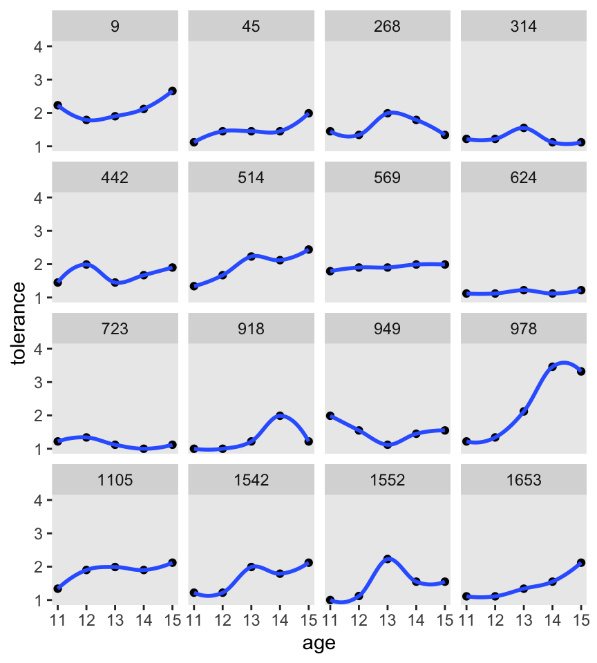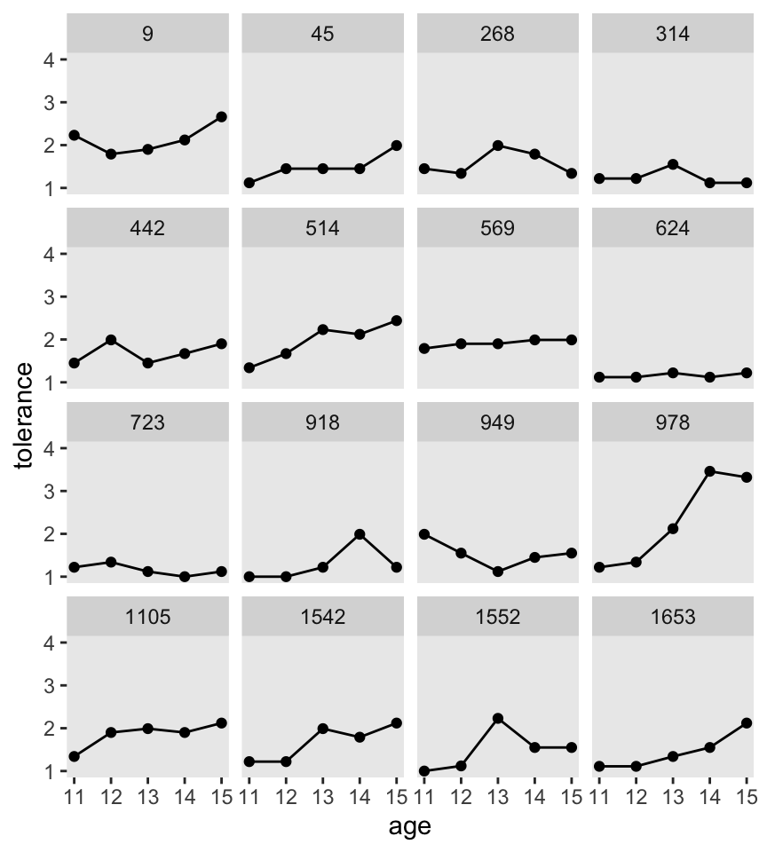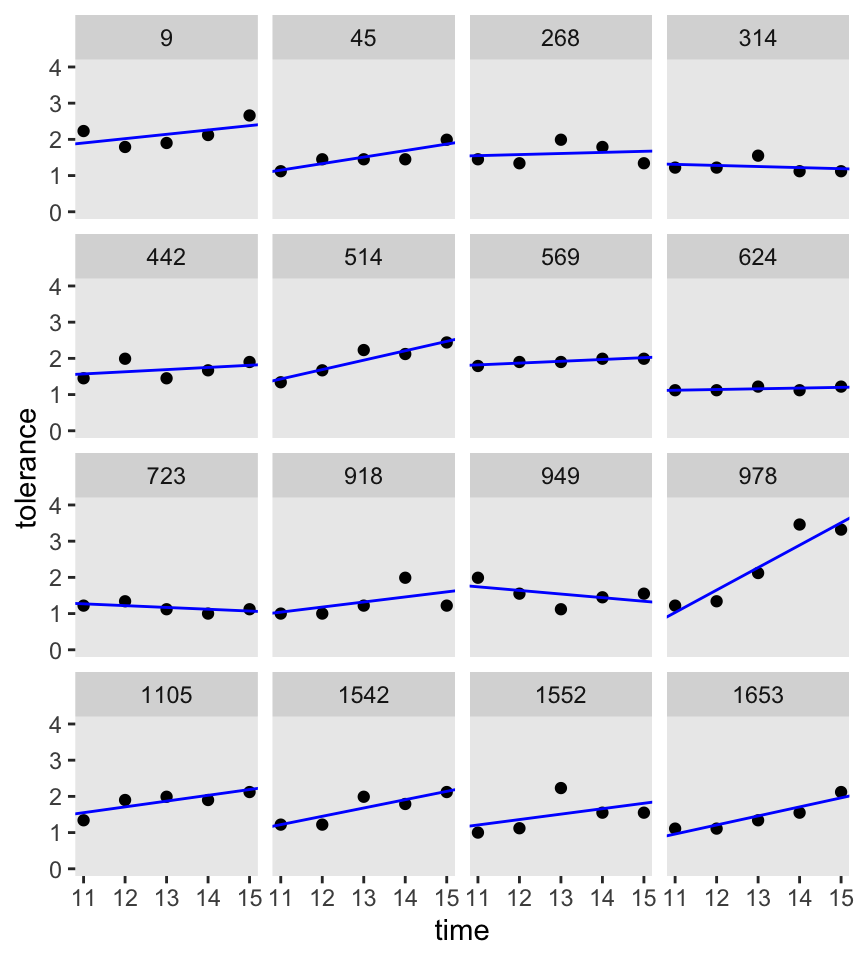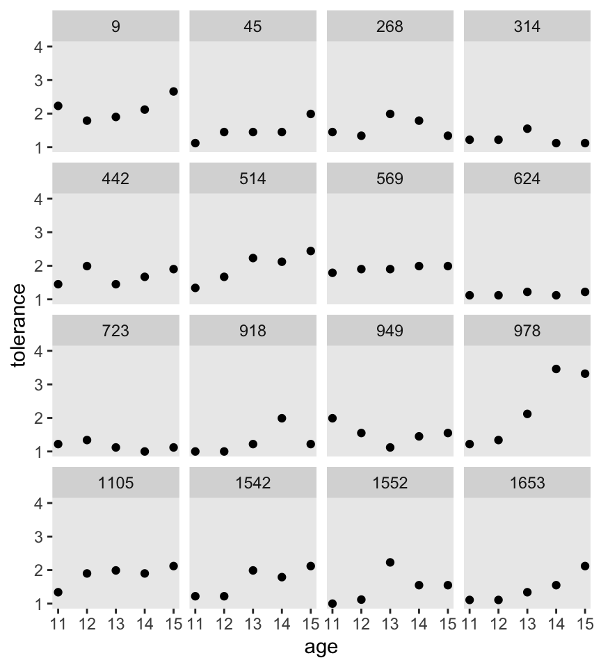 Empirical growth plots show individual-level sequence in a variable of interest over time. We’ll put age on the \(x\)-axis, tolerance on the y-axis, and make our variant of Figure 2.2 with geom_point(). It’s the facet_wrap() part of the code that splits the plot up by id.