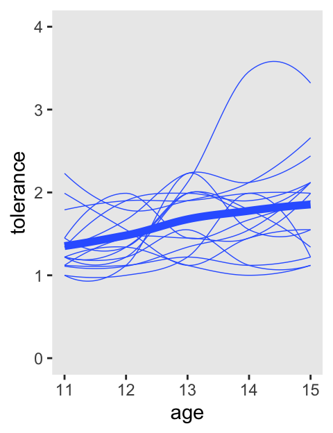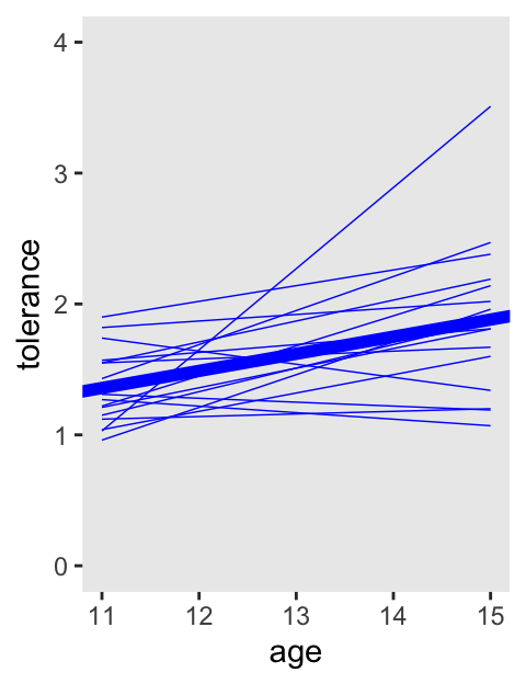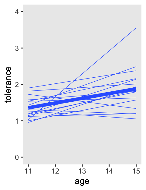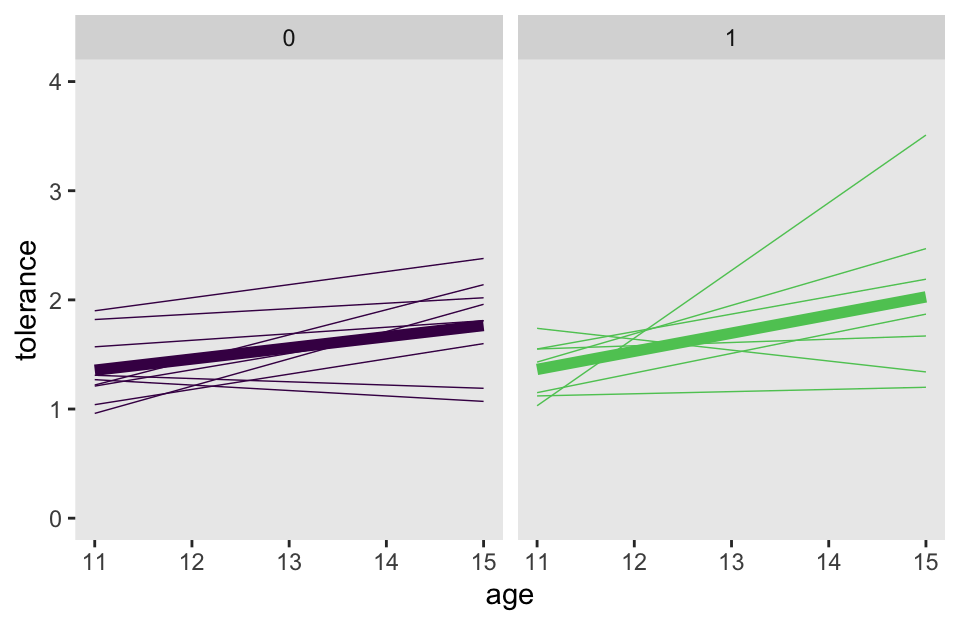 tol_fitted_male <-tibble(male =rep(0:1, each =2),age =rep(c(11, 15), times =2)) %>%mutate(time = age -11) %>%mutate(tolerance =fixef(fit2.4)[1, 1] +fixef(fit2.4)[2, 1] * time +fixef(fit2.4)[3, 1] * male +fixef(fit2.4)[4, 1] * time * male)tol_fitted_male
