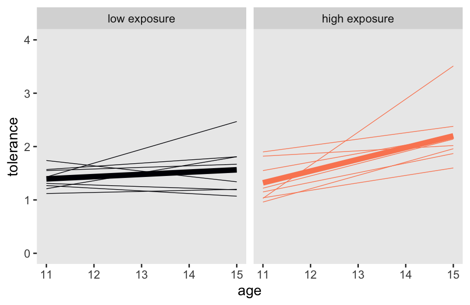 tol_fitted %>%# we need to add `exposure_01` values to `tol_fitted`left_join(tolerance_pp %>%select(id, exposure_01),by ="id") %>%mutate(exposure =if_else(exposure_01 ==1, "high exposure", "low exposure") %>%factor(., levels =c("low exposure", "high exposure"))) %>%ggplot(aes(x = age, y = tolerance, color = exposure)) +geom_line(aes(group = id),linewidth =1/4) +geom_line(data = tol_fitted_exposure,linewidth =2) +scale_color_viridis_d(option ="A", end =0.75) +coord_cartesian(ylim =c(0, 4)) +theme(legend.position ="none",panel.grid =element_blank()) +facet_wrap(~ exposure)