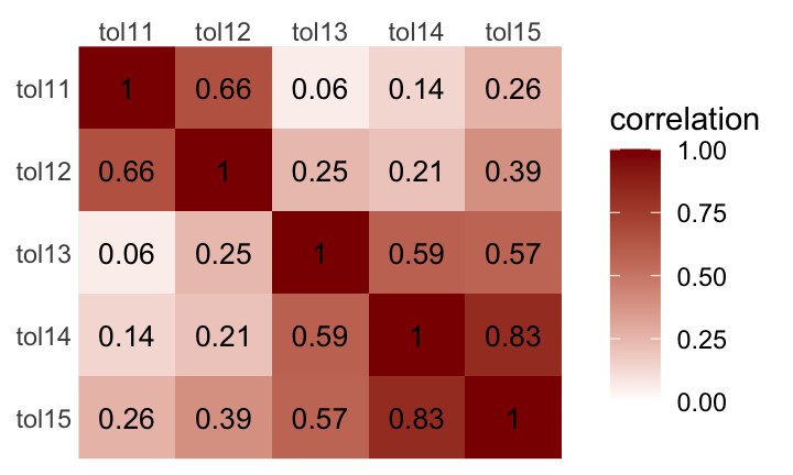 With the base Rcor() function, you can get the Pearson’s correlation matrix shown in Table 2.1.