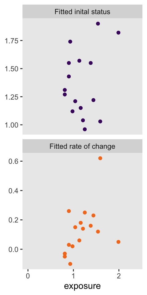 p2 <- mean_structure %>%pivot_longer(ends_with("est")) %>%mutate(name =factor(name, labels =c("Fitted inital status", "Fitted rate of change"))) %>%# we need to add `male` values to `tol_fitted`left_join(tolerance_pp %>%select(id, exposure),by ="id") %>%ggplot(aes(x = exposure, y = value, color = name)) +geom_point(alpha =1/2) +scale_color_viridis_d(option ="B", begin =0.2, end =0.7) +scale_x_continuous(breaks =0:2,limits =c(0, 2.4)) +labs(y =NULL) +theme(legend.position ="none",panel.grid =element_blank()) +facet_wrap(~ name, scale ="free_y", ncol =1)p2