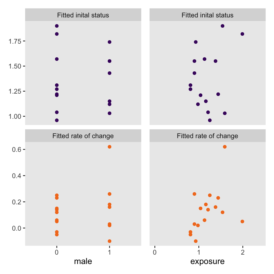 p1 <- mean_structure %>%pivot_longer(ends_with("est")) %>%mutate(name =factor(name, labels =c("Fitted inital status", "Fitted rate of change"))) %>%# we need to add `male` values to `tol_fitted`left_join(tolerance_pp %>%select(id, male),by ="id") %>%ggplot(aes(x =factor(male), y = value, color = name)) +geom_point(alpha =1/2) +scale_color_viridis_d(option ="B", begin =0.2, end =0.7) +labs(x ="male",y =NULL) +theme(legend.position ="none",panel.grid =element_blank()) +facet_wrap(~ name, scale ="free_y", ncol =1)p1