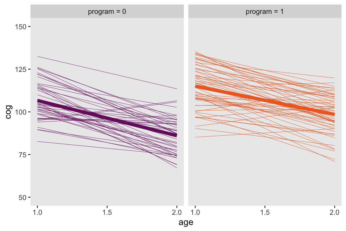 early_int_sim <- early_int_sim %>%mutate(label =str_c("program = ", program)) early_int_sim %>%ggplot(aes(x = age, y = cog, color = label)) +stat_smooth(aes(group = id),method ="lm", se = F, size =1/6) +stat_smooth(method ="lm", se = F, size =2) +scale_color_viridis_d(option ="B", begin =0.33, end =0.67) +scale_x_continuous(breaks =c(1, 1.5, 2)) +ylim(50, 150) +theme(legend.position ="none",panel.grid =element_blank()) +facet_wrap(~ label)