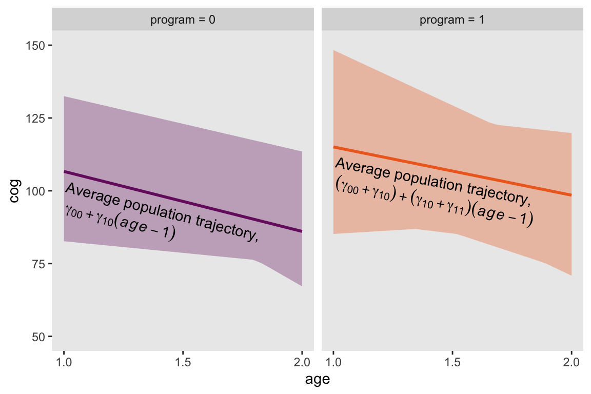 p %>%ggplot(aes(x = age)) +geom_ribbon(aes(ymin = min, ymax = max, fill = label),alpha =1/3) +stat_smooth(data = early_int_sim,aes(y = cog, color = label),method ="lm", se = F, size =1) +geom_text(data = text,aes(y = cog, label = text, angle = angle),hjust =0) +geom_text(data = math,aes(y = cog, label = text, angle = angle),hjust =0, parse = T) +scale_fill_viridis_d(option ="B", begin =0.33, end =0.67) +scale_color_viridis_d(option ="B", begin =0.33, end =0.67) +scale_x_continuous(breaks =c(1, 1.5, 2)) +scale_y_continuous("cog", limits =c(50, 150)) +theme(legend.position ="none",panel.grid =element_blank()) +facet_wrap(~ label)