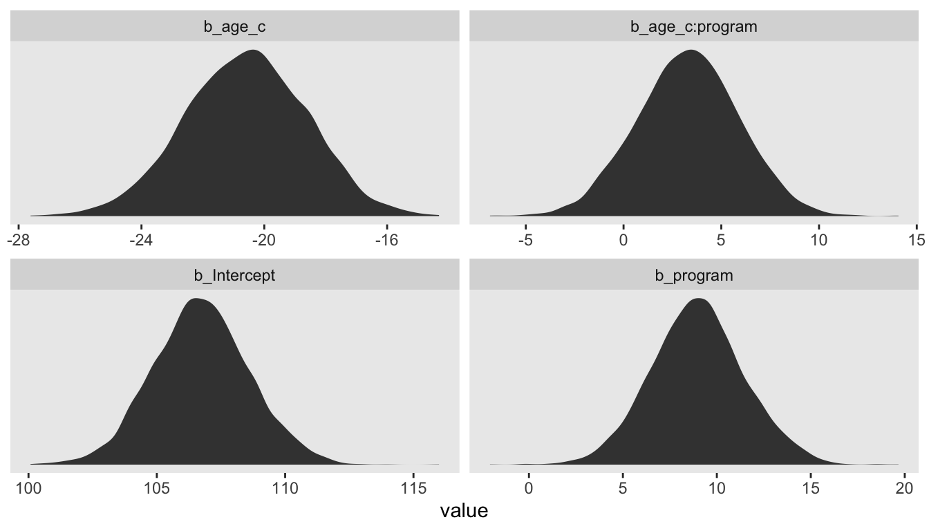 To make our version of Figure 3.5, we’ll pump the necessary age_c and program values into the full formula of the fixed effects.
