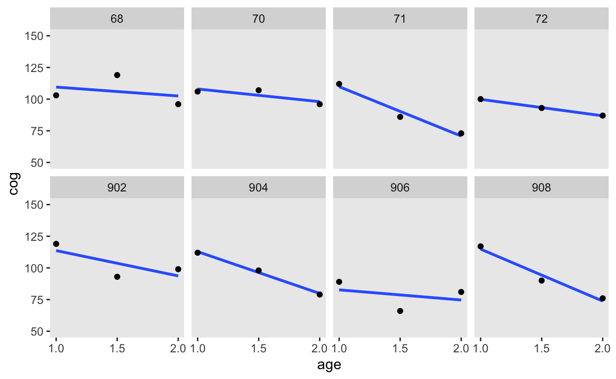 But anyways, here we go on to fit 103 individual OLS models, one for each of the id levels. Don’t worry; we’ll depart from this madness shortly.