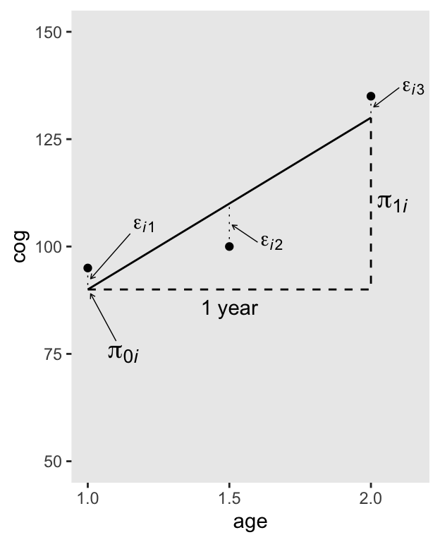 path <-tibble(age =c(1, 2, 2),cog =c(90, 90, 130))text <-tibble(age =c(1.2, 1.65, 2.15, 1.125, 2.075),cog =c(105, 101, 137, 75, 110),label =c("epsilon[italic(i)][1]", "epsilon[italic(i)][2]", "epsilon[italic(i)][3]", "pi[0][italic(i)]", "pi[1][italic(i)]"))arrow <-tibble(age =c(1.15, 1.6, 2.1, 1.1),xend =c(1.01, 1.51, 2.01, 1.01),cog =c(103, 101, 137, 78),yend =c(92.5, 105, 132.5, 89))# we're finally ready to plot!f %>%ggplot(aes(x = age, y = cog)) +geom_point() +# the main fitted trajectorygeom_line(aes(y = fitted)) +# the thick dashed line bending upward at age == 2geom_path(data = path,linewidth =1/2, linetype =2) +# the thin dashed vertical lines extending from the data dots to the fitted linegeom_segment(aes(xend = age, y = cog, yend = fitted),linetype =3, linewidth =1/4) +# the arrowsgeom_segment(data = arrow,aes(xend = xend, yend = yend),arrow =arrow(length =unit(0.1, "cm")), linewidth =1/4) +# the statistical notationgeom_text(data = text,aes(label = label),size =c(4, 4, 4, 5, 5), parse = T) +# "1 year"annotate(geom ="text",x =1.5, y =86, label ="1 year") +scale_x_continuous(breaks =c(1, 1.5, 2)) +ylim(50, 150) +theme(panel.grid =element_blank())