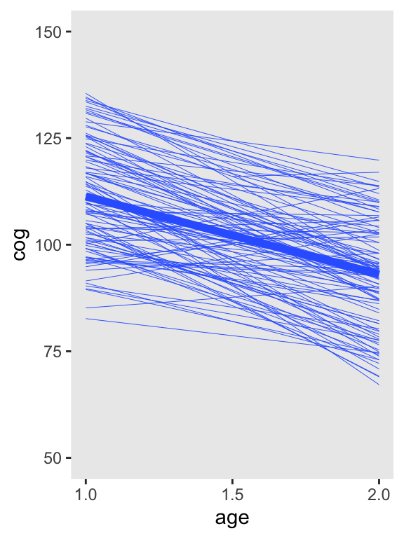 # specify the values for our covariates `age_c` and `program`crossing(age_c =0:1,program =0:1) %>%# push those values through the fixed effectsmutate(cog =fixef(fit3.2)[1, 1] +fixef(fit3.2)[2, 1] * age_c +fixef(fit3.2)[3, 1] * program +fixef(fit3.2)[4, 1] * age_c * program,# wrangle a bitage = age_c +1,size =ifelse(program ==1, 1/5, 3),program =factor(program, levels =c("0", "1"))) %>%# plot!ggplot(aes(x = age, y = cog, group = program)) +geom_line(aes(size = program)) +scale_size_manual(values =c(1, 1/2)) +scale_x_continuous(breaks =c(1, 1.5, 2)) +ylim(50, 150) +theme(legend.position ="none",panel.grid =element_blank())