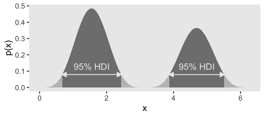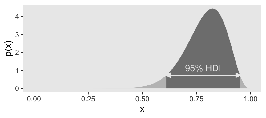 When the distribution refers to credibility of values, then the width of the HDI is another way of measuring uncertainty of beliefs. If the HDI is wide, then beliefs are uncertain. If the HDI is narrow, then beliefs are relatively certain. (p. 89)