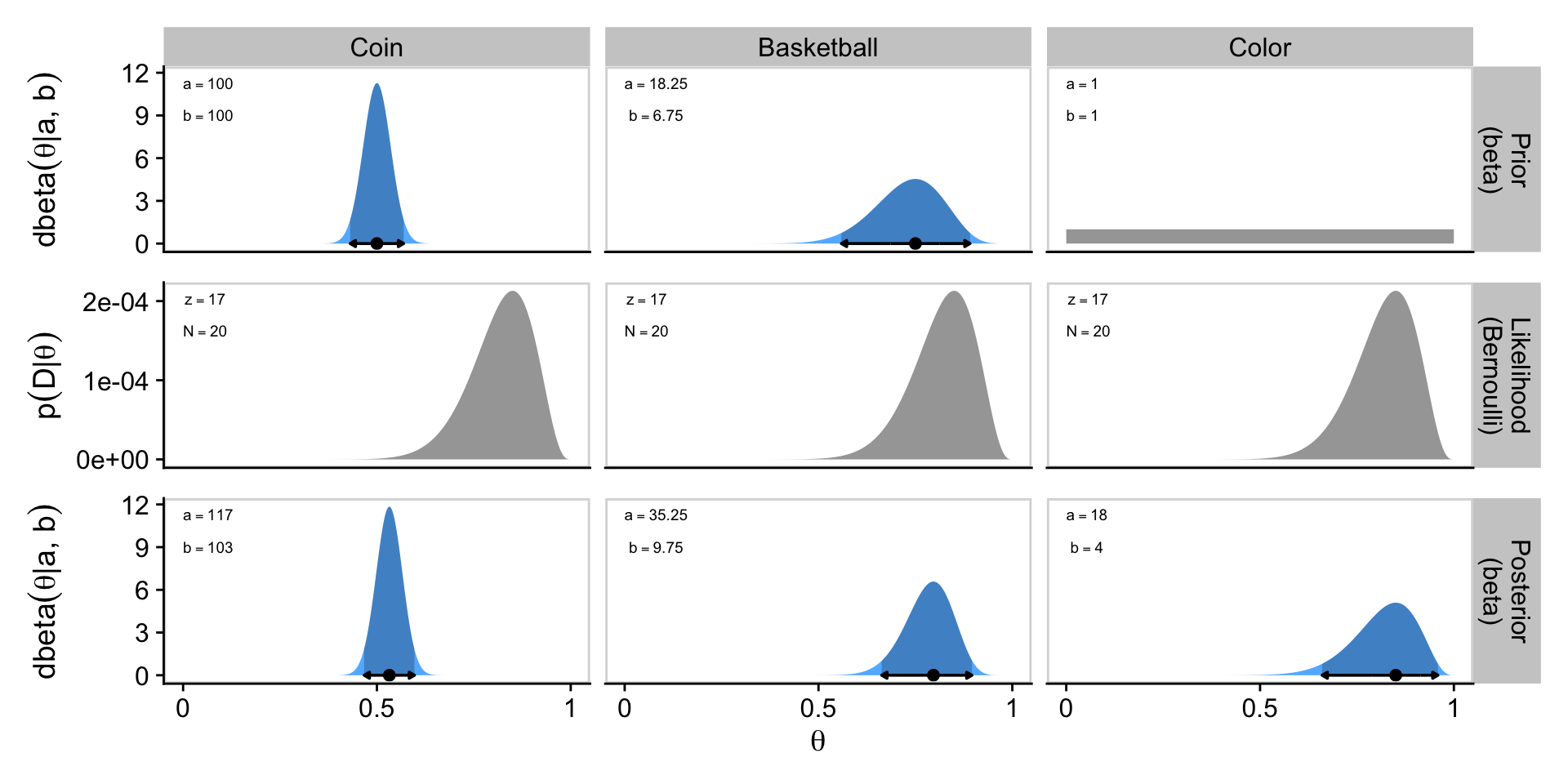 In principle, we could use any probability density function supported on the interval \([0, 1]\). When we intend to apply Bayes’ rule (Equation 5.7, p. 106), however, there are two desiderata for mathematical tractability. First, it would be convenient if the product of \(p(y \mid \theta)\) and \(p(\theta)\), which is in the numerator of Bayes’ rule, results in a function of the same form as \(p(\theta)\)… Second, we desire the denominator of Bayes’ rule (Equation 5.9, p. 107), namely \(\int \text d \theta\ p(y \mid \theta) p(\theta)\), to be solvable analytically. This quality also depends on how the form of the function \(p(\theta)\) relates to the form of the function \(p(y \mid \theta)\). When the forms of \(p(y \mid \theta)\) and \(p(\theta)\) combine so that the posterior distribution has the same form as the prior distribution, then \(p(\theta)\) is called a conjugate prior for \(p(y \mid \theta)\). (p. 127 emphasis in the original)