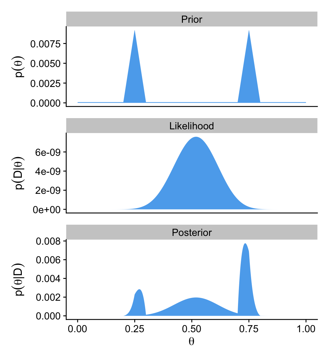 With our nice tibble in hand, we’ll plot the prior, likelihood and posterior one at a time, and then combine them with patchwork syntax.