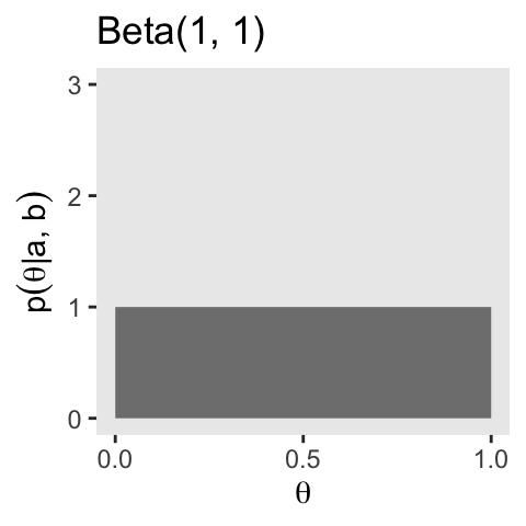 Though the \(a\) and \(b\) parameters in the beta distribution might initially seem confusing, they have a nice connection to the kinds of binary coin-flipping-type data we explores with the Bernoulli distribution in the last chapter. As Kruschke wrote: “You can think of \(a\) and \(b\) in the prior as if they were previously observed data, in which there were \(a\) heads and \(b\) tails in a total of \(n = a + b\) flips” (pp. 127–128). For example, a popular default minimally-informative prior would be \(\operatorname{Beta}(1, 1)\), which is like the sum of two coin flips of one tails and one heads. That produces a uniform distribution like so: