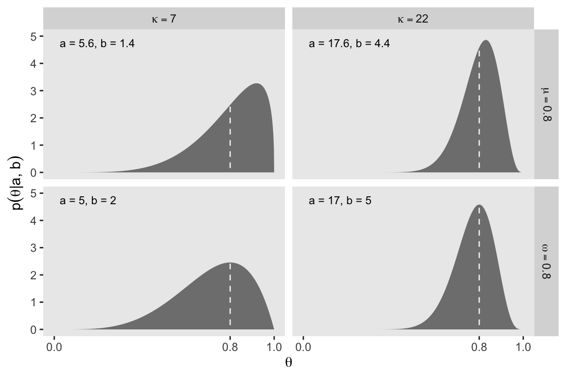 If we further explore Kruschke’s formulas, we learn you can specify a beta distribution in terms of \(\omega\) and \(\kappa\) by