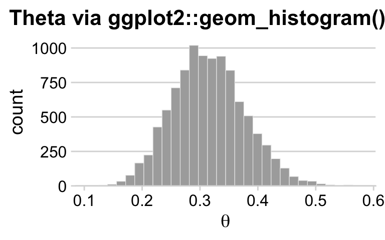 With our prior draws in hand, we’re almost ready to make the prior histograms of Figure 8.7. But first we’ll want to determine the \(z/N\) values in order to mark them off in the plots. [You’ll note Kruschke did so with gray plus marks in his.]
