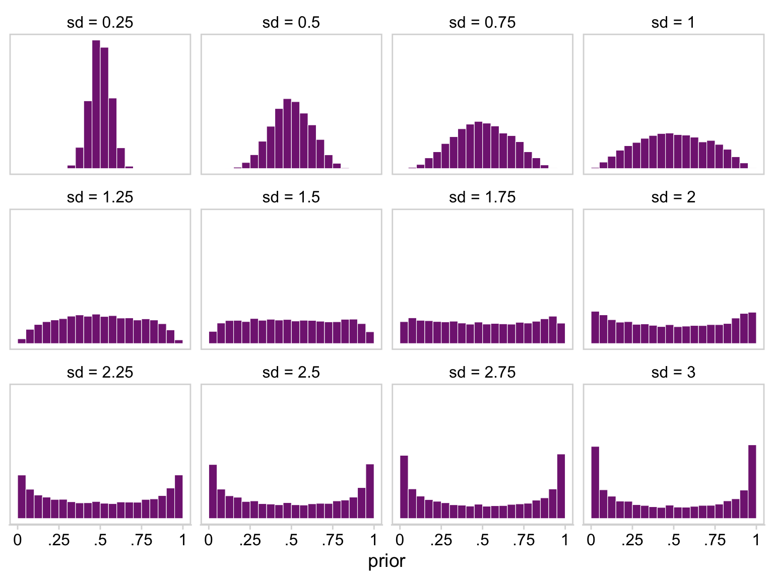 # Define a functionr_norm <-function(i, n =1e4) {set.seed(1)rnorm(n = n, mean =0, sd = i) |>plogis()}# Simulate and wrangletibble(sd =seq(from =0.25, to =3, by =0.25)) |>group_by(sd) |>mutate(prior =map(sd, r_norm)) |>unnest(prior) |>ungroup() |>mutate(sd =str_c("sd = ", sd)) |># Plot!ggplot(aes(x = prior)) +geom_histogram(binwidth =0.05, boundary =0, color ="white",fill = a_purple, linewidth =0.2) +scale_x_continuous(labels =c(0, ".25", ".5", ".75", 1)) +scale_y_continuous(NULL, breaks =NULL) +coord_cartesian(xlim =c(0, 1)) +theme_minimal_hgrid() +panel_border() +facet_wrap(~ sd)