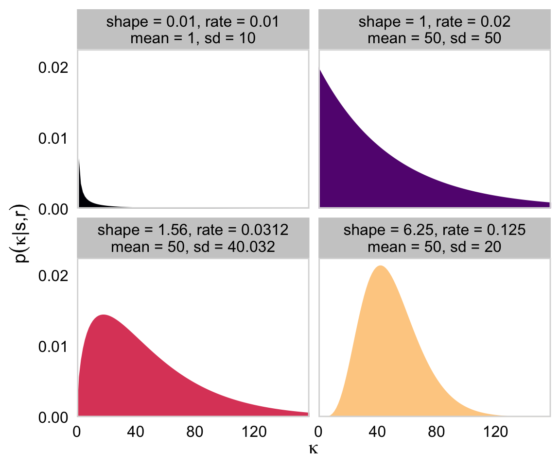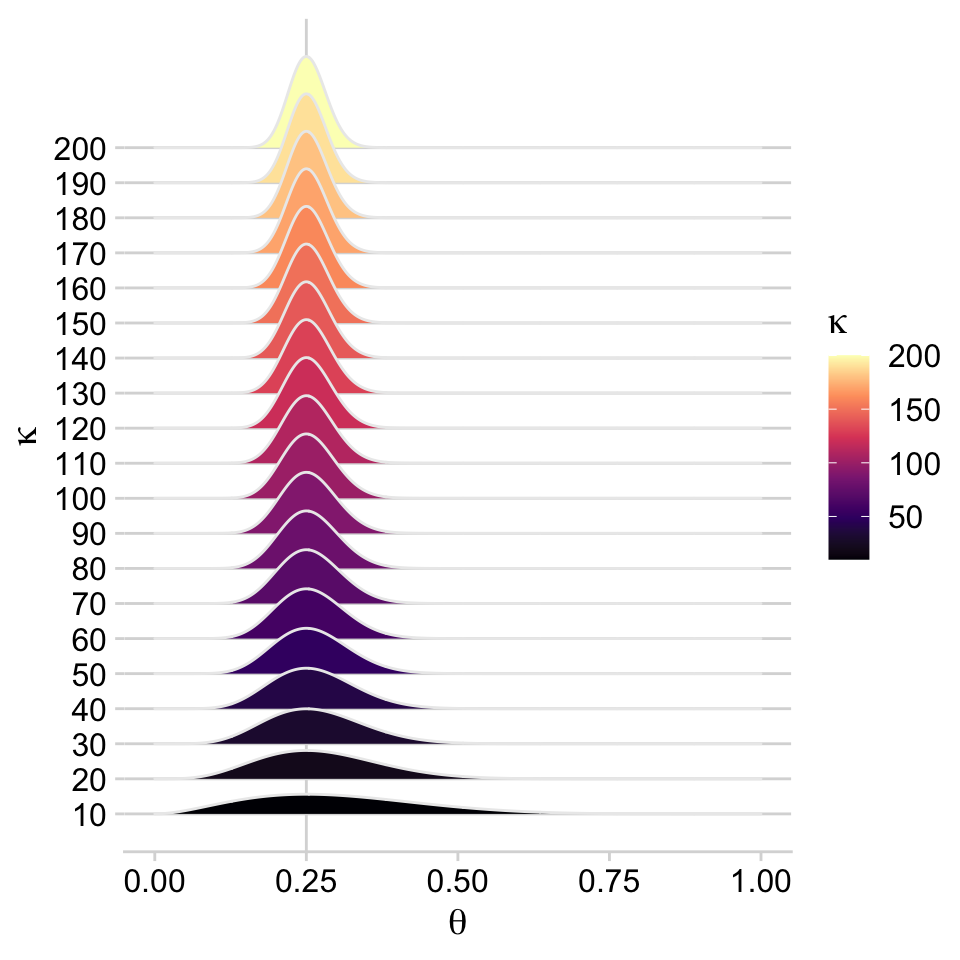 # Load packageslibrary(tidyverse)library(cowplot)library(ggridges)library(ggforce)library(patchwork)library(viridis)library(brms)library(bayesplot)library(tidybayes)# Define functionbeta_by_k <-function(k) { w <-0.25tibble(x =seq(from =0, to =1, length.out =1000)) |>mutate(theta =dbeta(x = x,shape1 = w * (k -2) +1,shape2 = (1- w) * (k -2) +1))}# Datatibble(k =seq(from =10, to =200, by =10)) |>mutate(theta =map(k, beta_by_k)) |>unnest(theta) |># Plotggplot(aes(x = x, y = k,height = theta,group = k, fill = k)) +geom_vline(xintercept =0.25, color ="grey85", linewidth =1/2) +geom_ridgeline(color ="grey92", scale =2, size =1/5) +scale_y_continuous(expression(kappa), breaks =1:20*10) +scale_fill_viridis_c(expression(kappa), option ="A") +xlab(expression(theta)) +theme_minimal_hgrid()