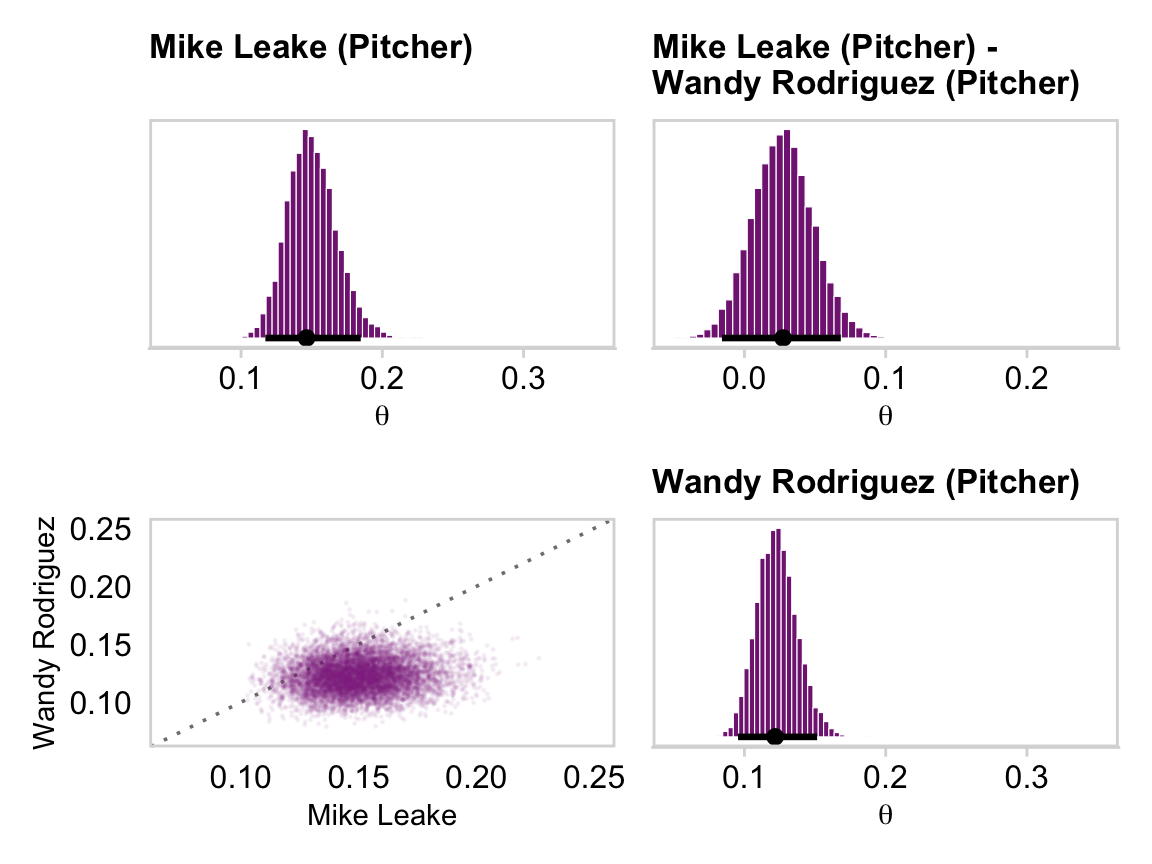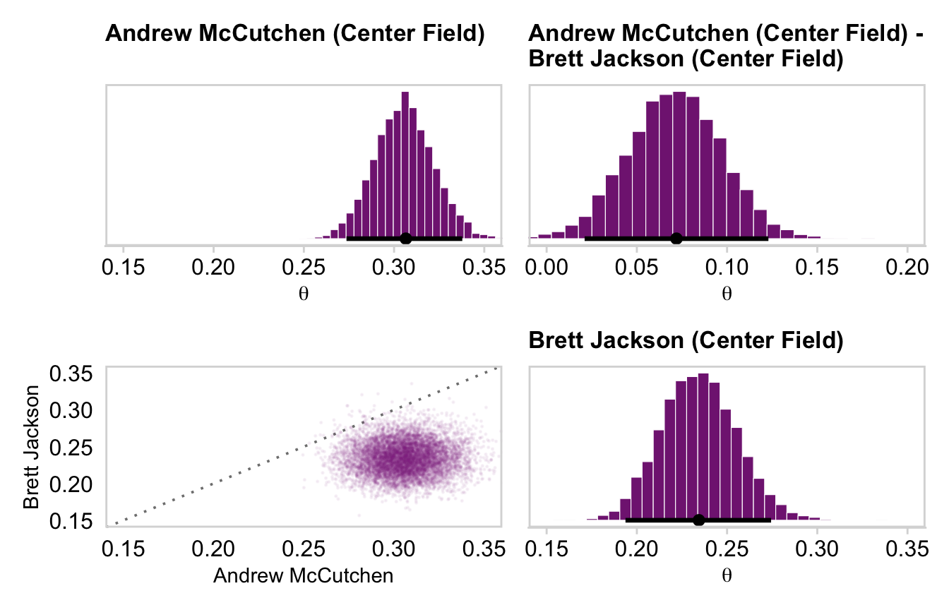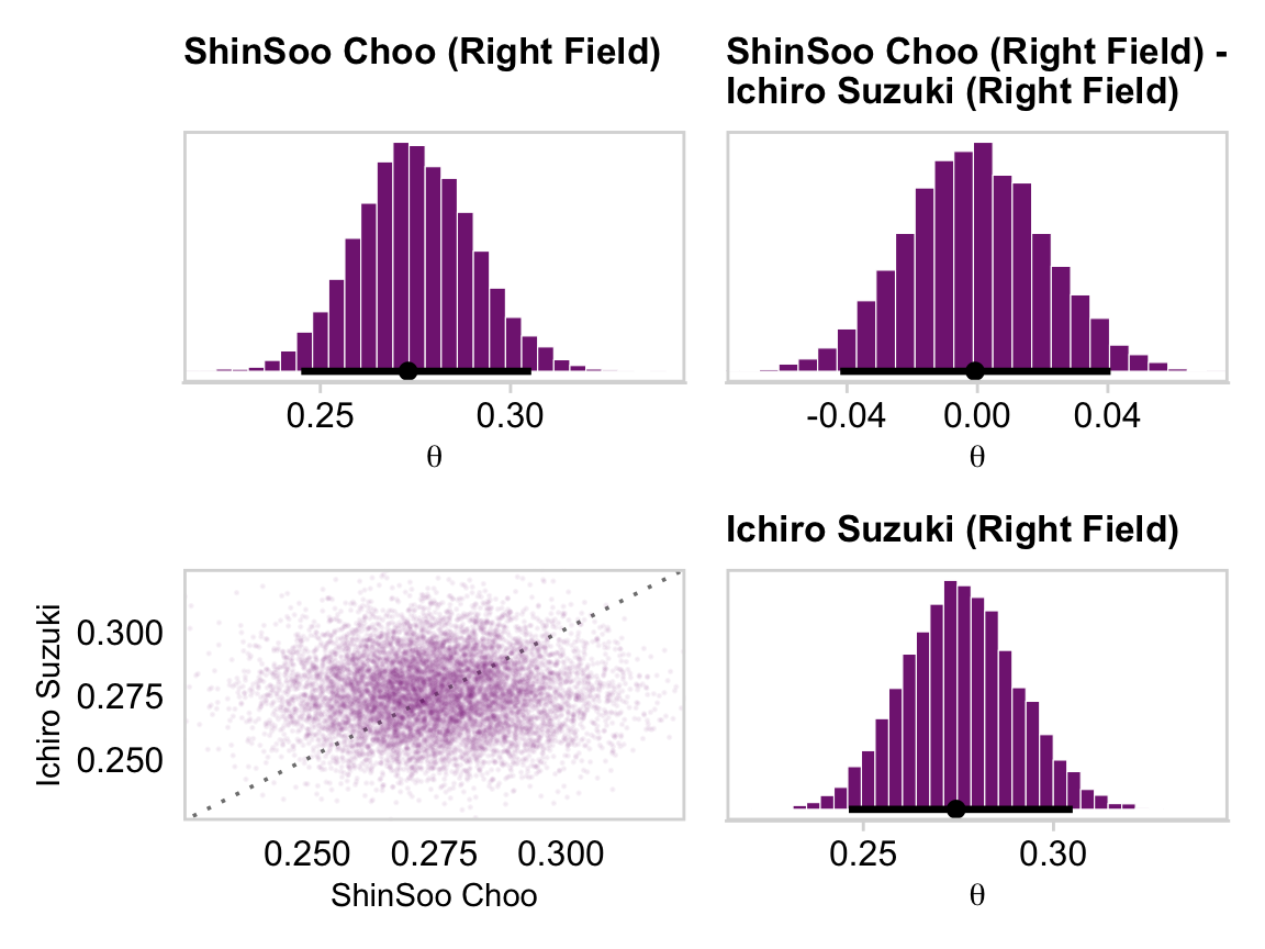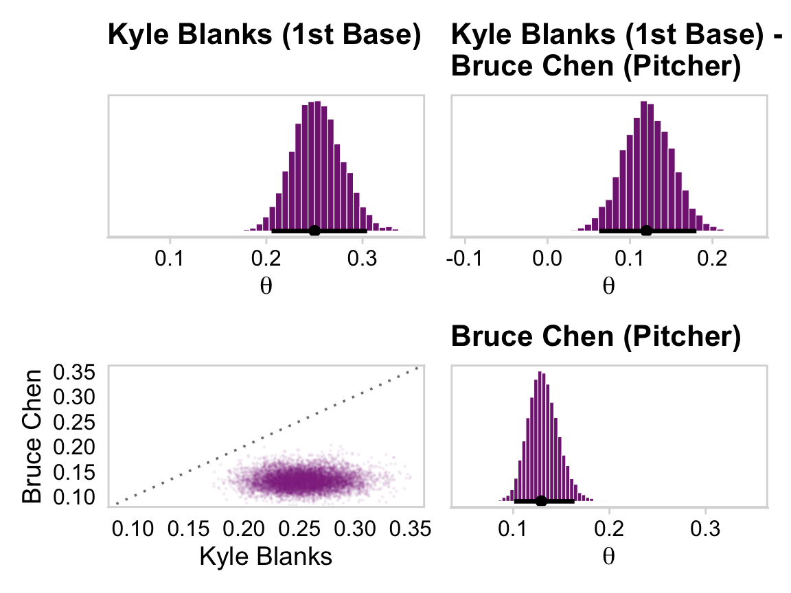 # This will make life easier. Just go with itname_list <-c("Kyle Blanks", "Bruce Chen", "ShinSoo Choo", "Ichiro Suzuki", "Mike Leake", "Wandy Rodriguez", "Andrew McCutchen", "Brett Jackson")# We'll define the data we'd like to feed into `fitted()`, herend <- my_data |>filter(Player %in% name_list) |># These last two lines aren't typically necessary, but they allow us to# arrange the rows in the same order we find the names in Figures 9.15 and 9.16mutate(Player =factor(Player, levels = name_list)) |>arrange(Player)fitted_players <-fitted( fit9.2, newdata = nd,scale ="linear",summary =FALSE) |>as_tibble() |># Rename the values as returned by `as_tibble()`set_names(name_list) |># Convert the values from the logit scale to the probability scalemutate_all(.funs = plogis) |># In this last section, we make our difference distributions mutate(`Kyle Blanks - Bruce Chen`=`Kyle Blanks`-`Bruce Chen`,`ShinSoo Choo - Ichiro Suzuki`=`ShinSoo Choo`-`Ichiro Suzuki`,`Mike Leake - Wandy Rodriguez`=`Mike Leake`-`Wandy Rodriguez`,`Andrew McCutchen - Brett Jackson`=`Andrew McCutchen`-`Brett Jackson`)glimpse(fitted_players)