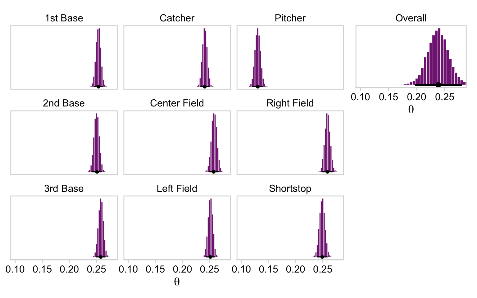 p1 <- fitted_positions |>pivot_longer(cols =everything(), values_to ="theta") |># Though technically not needed, this line reorders the panels to match the textmutate(name =factor(name, levels =c("1st Base", "Catcher", "Pitcher", "2nd Base", "Center Field", "Right Field", "3rd Base", "Left Field", "Shortstop"))) |>ggplot(aes(x = theta)) +geom_histogram(binwidth =0.0025, color ="white", fill = a_purple, linewidth =0.1) +stat_pointinterval(aes(y =0), point_interval = mode_hdi, .width =0.95, size =1) +scale_y_continuous(NULL, breaks =NULL) +xlab(expression(theta)) +coord_cartesian(xlim =c(0.1, 0.28)) +theme_minimal_hgrid() +panel_border() +facet_wrap(~ name, nrow =3, scales ="free_y")