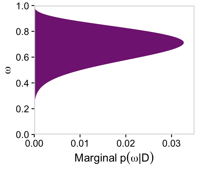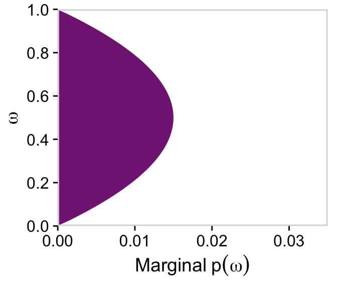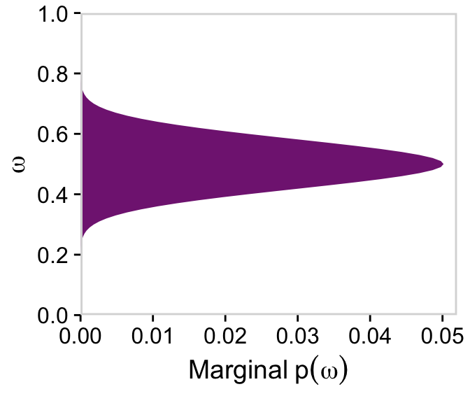 # For omegad |>group_by(omega) |>summarise(posterior =sum(posterior)) |>ggplot(aes(x = omega, y = posterior)) +geom_marginal(ul =0.052) +labs(x =expression(omega),y =expression(Marginal~p(omega*"|"*D))) +coord_flip()