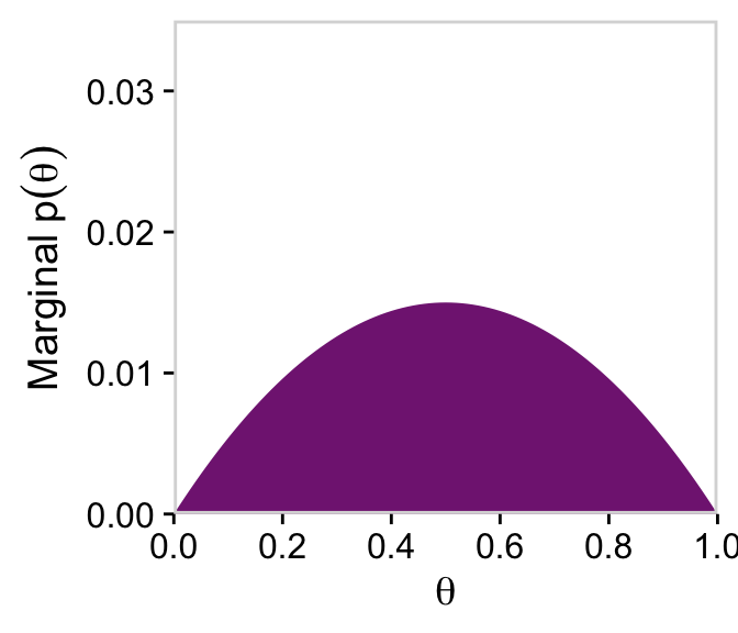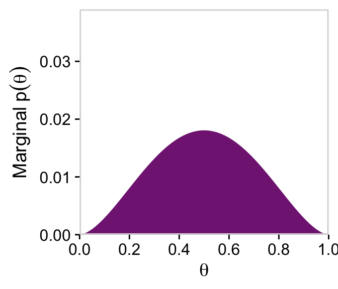 d |>group_by(theta) |>summarise(prior =sum(prior)) |>ggplot(aes(x = theta, y = prior)) +geom_marginal(ul =0.035) +labs(x =expression(theta),y =expression(Marginal~p(theta)))