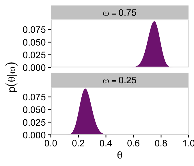 That is, in the second line of the equation, the probability of \(y\) was only conditional on \(\theta\). But the reason we call this a hierarchical model is because the probability of \(\theta\) itself is conditioned on \(\omega\). The prior itself had a prior.