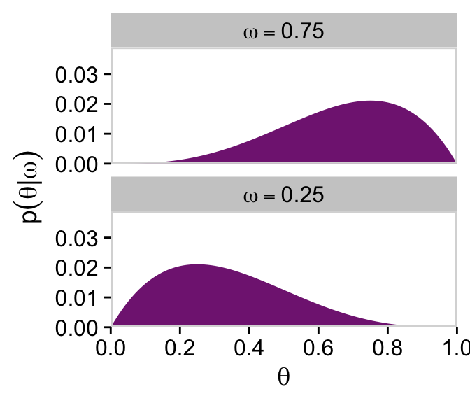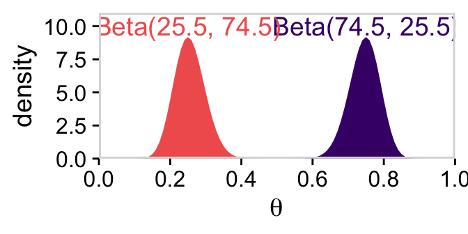 # We'll want this for the annotationd_text <-tibble(theta =c(0.75, 0.25),y =10,label =c("Beta(74.5, 25.5)", "Beta(25.5, 74.5)"),omega = letters[1:2])# Here's the primary data for the plottibble(theta =rep(parameter_space, times =2),alpha =rep(c(74.5, 25.5), each =101),beta =rep(c(25.5, 74.5), each =101),omega =rep(letters[1:2], each =101)) |># The plotggplot(aes(x = theta, fill = omega)) +geom_area(aes(y =dbeta(x = theta, shape1 = alpha, shape2 = beta))) +geom_text(data = d_text,aes(y = y, label = label, color = omega)) +scale_x_continuous(expression(theta), breaks =0:5/5, expand =c(0, 0), limits =c(0, 1)) +scale_y_continuous("density", expand =c(0, 0), limits =c(0, 11)) +scale_fill_viridis_d(option ="A", begin =2/9, end =6/9) +scale_color_viridis_d(option ="A", begin =2/9, end =6/9) +theme_cowplot() +panel_border() +theme(axis.line =element_blank(),legend.position ="none")