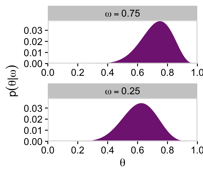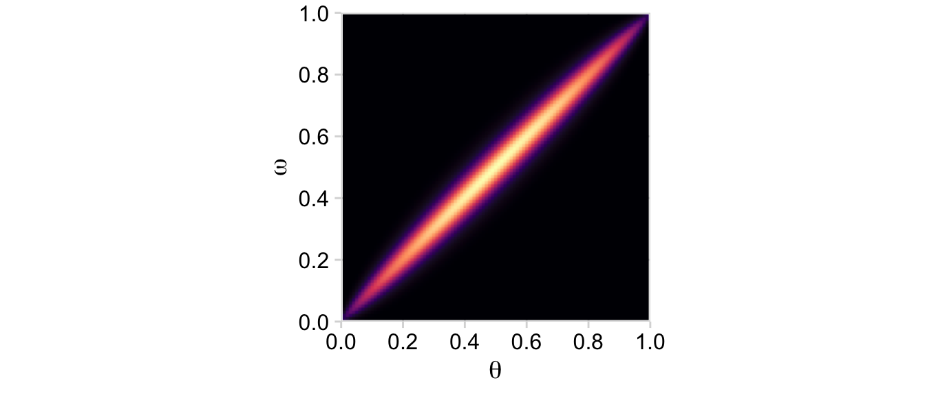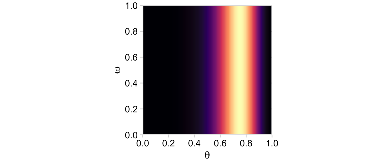 Note how this plot demonstrates how the likelihood is solely dependent on \(\theta\); it’s orthogonal to \(\omega\). This is the visual consequence of Kruschke’s Formula 9.6,