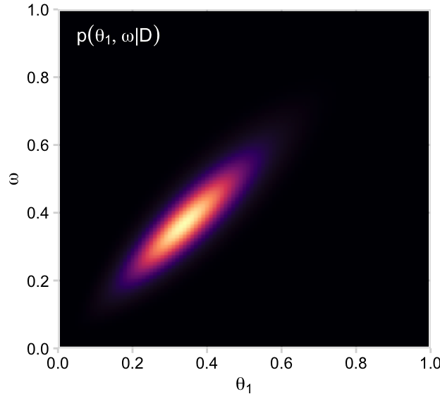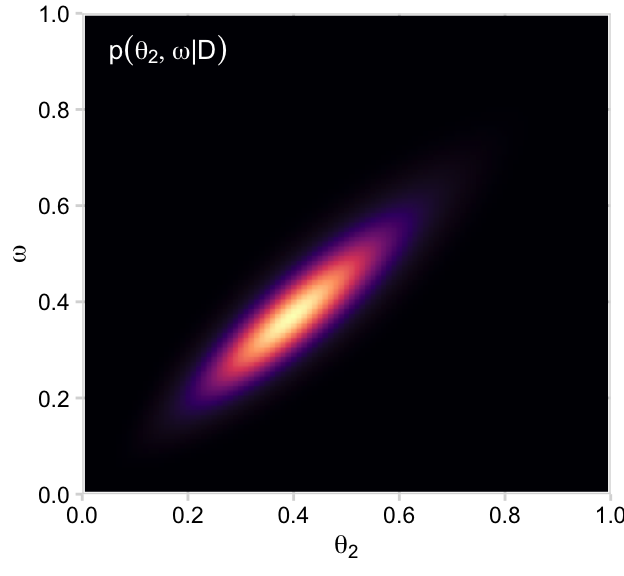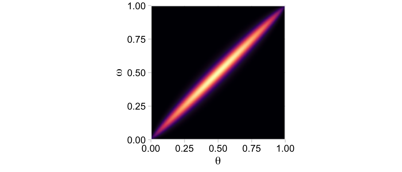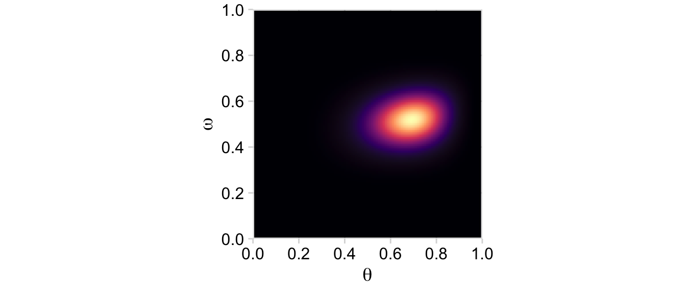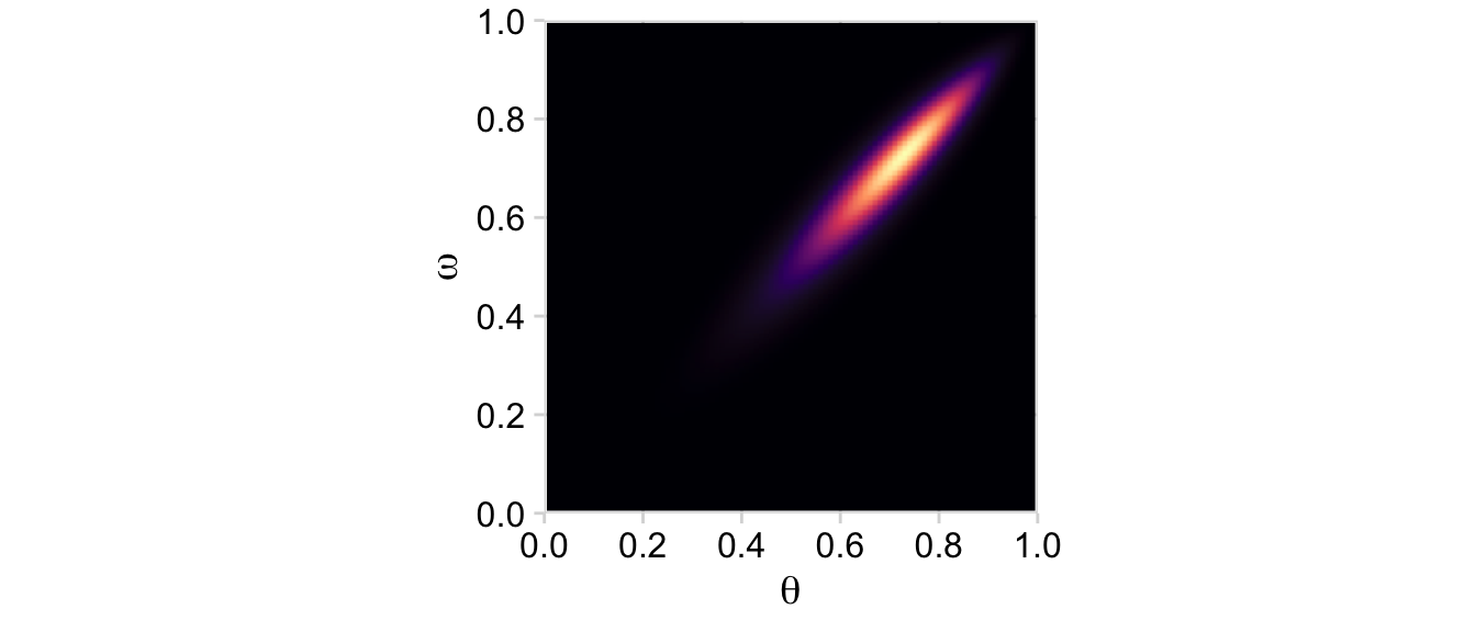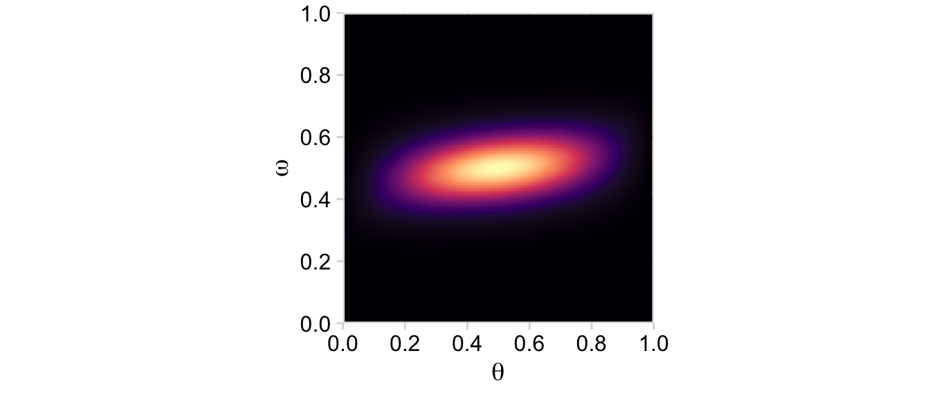 Now on to the posterior. Our first depiction will be the middle panel of the second row from the bottom of Figure 9.3. This will be \(p(\theta, \omega \mid y)\).