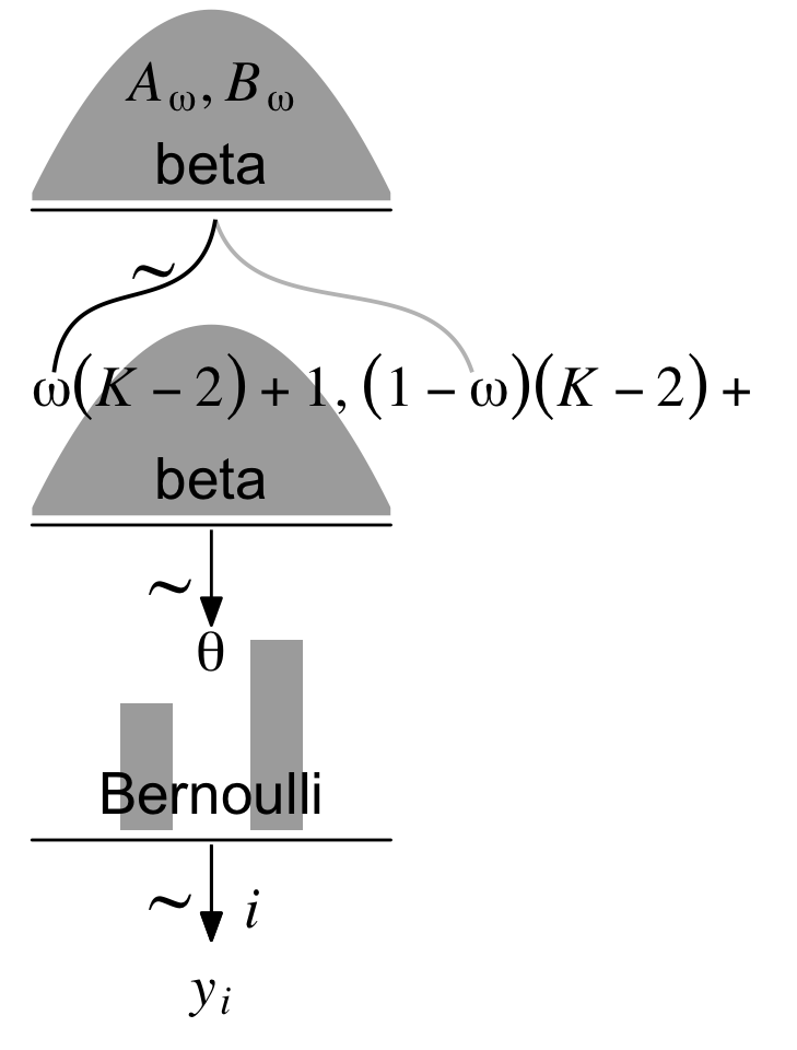 p1 <-tibble(x =seq(from =0.01, to =0.99, by =0.01),d = (dbeta(x, 2, 2)) /max(dbeta(x, 2, 2))) |>ggplot(aes(x = x, y = d)) +geom_area(fill ="grey67") +annotate(geom ="text",x =0.5, y =0.2,label ="beta",size =7) +annotate(geom ="text",x =0.5, y =0.6,label ="italic(A[omega])*', '*italic(B[omega])", family ="Times", parse =TRUE, size =7) +scale_x_continuous(expand =c(0, 0)) +theme_void() +theme(axis.line.x =element_line(linewidth =0.5))p2 <-tibble(x =c(0.5, 0.475, 0.26, 0.08, 0.06, 0.5, 0.55, 0.85, 1.15, 1.2),y =c(1, 0.7, 0.6, 0.5, 0.2, 1, 0.7, 0.6, 0.5, 0.2),line =rep(letters[2:1], each =5)) |>ggplot(aes(x = x, y = y)) +geom_bspline(aes(color = line),linewidth =2/3, show.legend =FALSE) +annotate(geom ="text",x =0, y =0.125,label ="omega(italic(K)-2)+1*', '*(1-omega)(italic(K)-2)+1",family ="Times", hjust =0, parse =TRUE, size =7) +annotate(geom ="text",x =1/3, y =0.7,label ="'~'",family ="Times", parse =TRUE, size =10) +scale_x_continuous(expand =c(0, 0), limits =c(0, 2)) +scale_color_manual(values =c("grey75", "black")) +ylim(0, 1) +theme_void()p3 <-tibble(x =seq(from =0.01, to =0.99, by =0.01),d = (dbeta(x, 2, 2)) /max(dbeta(x, 2, 2))) |>ggplot(aes(x = x, y = d)) +geom_area(fill ="grey67") +annotate(geom ="text",x =0.5, y =0.2,label ="beta",size =7) +scale_x_continuous(expand =c(0, 0)) +theme_void() +theme(axis.line.x =element_line(linewidth =0.5))## An annotated arrow# Save our custom arrow settingsmy_arrow <-arrow(angle =20, length =unit(0.35, "cm"), type ="closed")p4 <-tibble(x =0.5,y =1,xend =0.5,yend =0) |>ggplot(aes(x = x, xend = xend,y = y, yend = yend)) +geom_segment(arrow = my_arrow) +annotate(geom ="text",x =0.375, y =1/3,label ="'~'",family ="Times", parse =TRUE, size =10) +xlim(0, 1) +theme_void()# Bar plot of Bernoulli datap5 <-tibble(x =0:1,d = (dbinom(x, size =1, prob =0.6)) /max(dbinom(x, size =1, prob =0.6))) |>ggplot(aes(x = x, y = d)) +geom_col(fill ="grey67", width =0.4) +annotate(geom ="text",x =0.5, y =0.2,label ="Bernoulli",size =7) +annotate(geom ="text",x =0.5, y =0.94,label ="theta", family ="Times", parse =TRUE, size =7) +xlim(-0.75, 1.75) +theme_void() +theme(axis.line.x =element_line(linewidth =0.5))# another annotated arrowp6 <-tibble(x =c(0.375, 0.625),y =c(1/3, 1/3),label =c("'~'", "italic(i)")) |>ggplot(aes(x = x, y = y, label = label)) +geom_text(family ="Times", parse =TRUE, size =c(10, 7)) +geom_segment(x =0.5, xend =0.5,y =1, yend =0,arrow = my_arrow) +xlim(0, 1) +theme_void()# Some textp7 <-tibble(x =0.5,y =0.5,label ="italic(y[i])") |>ggplot(aes(x = x, y = y, label = label)) +geom_text(family ="Times", parse =TRUE, size =7) +xlim(0, 1) +theme_void()# Define the layoutlayout <-c(area(t =1, b =2, l =1, r =1),area(t =4, b =5, l =1, r =1),area(t =3, b =4, l =1, r =2),area(t =6, b =6, l =1, r =1),area(t =7, b =8, l =1, r =1),area(t =9, b =9, l =1, r =1),area(t =10, b =10, l =1, r =1))# Combine, adjust, and plot!(p1 + p3 + p2 + p4 + p5 + p6 + p7) +plot_layout(design = layout) &ylim(0, 1) &theme(plot.margin =margin(0, 5.5, 0, 5.5))