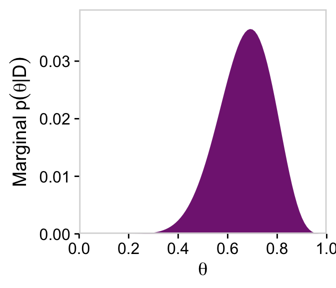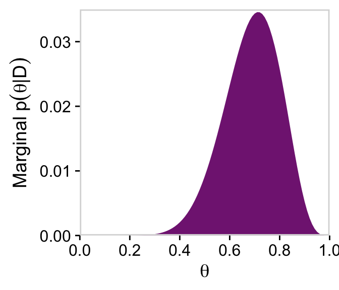 # For thetad |>group_by(theta) |>summarise(posterior =sum(posterior)) |>ggplot(aes(x = theta, y = posterior)) +geom_marginal(ul =0.035) +labs(x =expression(theta),y =expression(Marginal~p(theta*"|"*D))) +coord_cartesian()