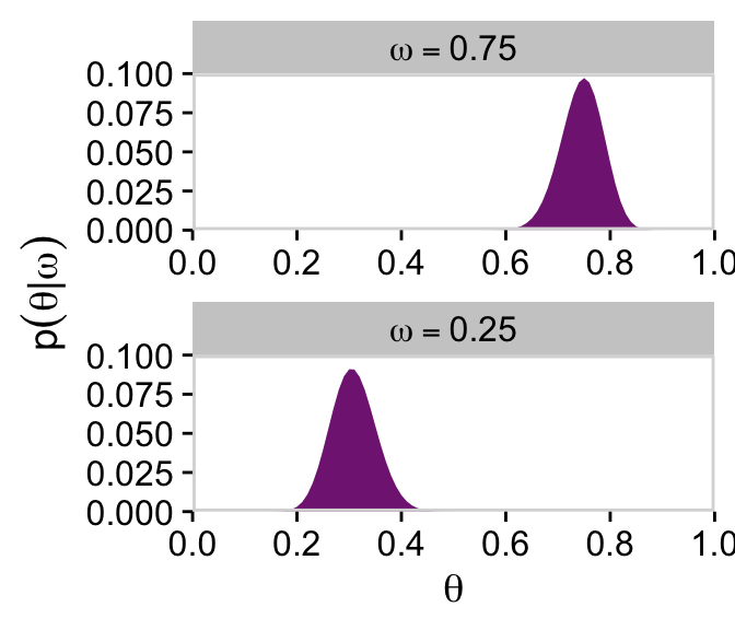 Note that after we slice with filter(), the next two wrangling lines renormalize those posterior slices into probability metrics. That is, when we take a slice through the joint posterior at a particular value of \(\omega\), and renormalize by dividing the sum of discrete probability masses in that slice, we get the conditional distribution \(p(\theta \mid \omega, D)\).