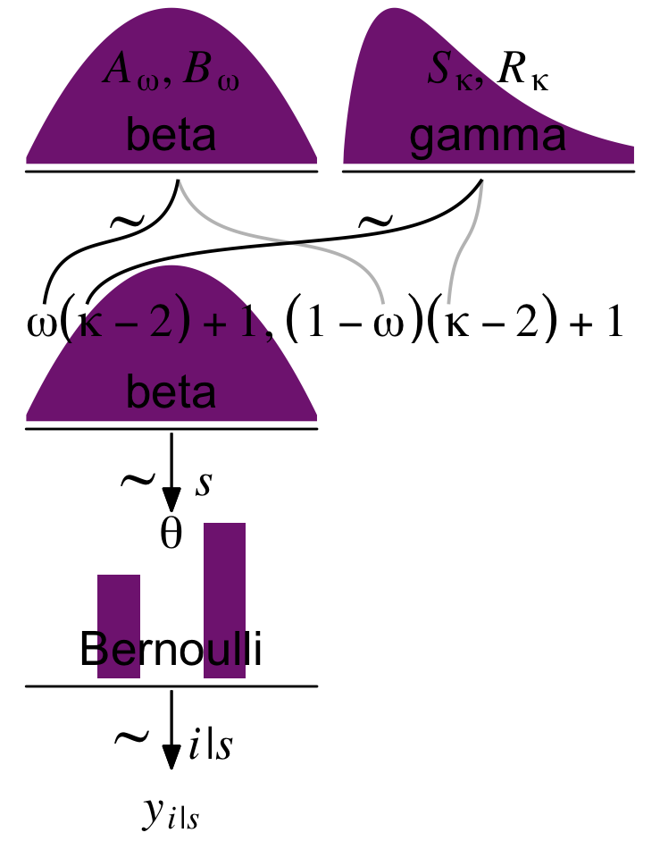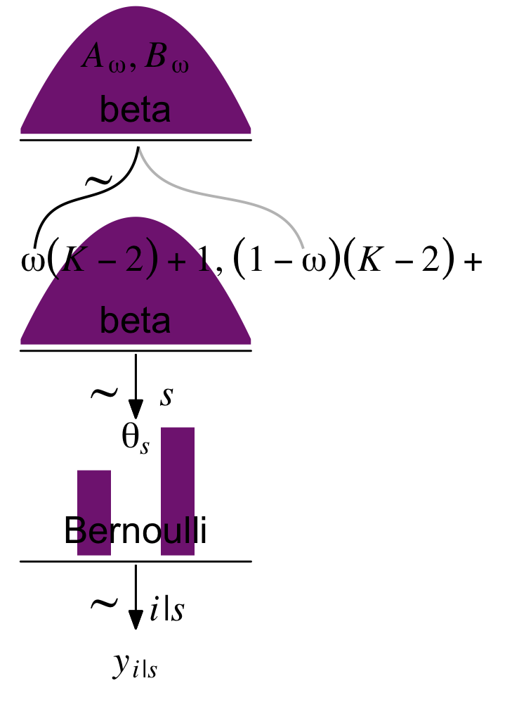 p1 <-tibble(x =seq(from =0.01, to =0.99, by =0.01),d = (dbeta(x, 2, 2)) /max(dbeta(x, 2, 2))) |>ggplot(aes(x = x, y = d)) +geom_area(fill = a_purple) +annotate(geom ="text",x =0.5, y =0.2,label ="beta",size =7) +annotate(geom ="text",x =0.5, y =0.6,label ="italic(A[omega])*', '*italic(B[omega])", family ="Times", parse =TRUE, size =7) +scale_x_continuous(expand =c(0, 0)) +theme_void() +theme(axis.line.x =element_line(linewidth =0.5))p2 <-tibble(x =c(0.5, 0.475, 0.26, 0.08, 0.06, 0.5, 0.55, 0.85, 1.15, 1.2),y =c(1, 0.7, 0.6, 0.5, 0.2, 1, 0.7, 0.6, 0.5, 0.2),line =rep(letters[2:1], each =5)) |>ggplot(aes(x = x, y = y)) +geom_bspline(aes(color = line),linewidth =2/3, show.legend =FALSE) +annotate(geom ="text",x =0, y =0.125,label ="omega(italic(K)-2)+1*', '*(1-omega)(italic(K)-2)+1",family ="Times", hjust =0, parse =TRUE, size =7) +annotate(geom ="text",x =1/3, y =0.7,label ="'~'",family ="Times", parse =TRUE, size =10) +scale_x_continuous(expand =c(0, 0), limits =c(0, 2)) +scale_color_manual(values =c("grey75", "black")) +ylim(0, 1) +theme_void()p3 <-tibble(x =seq(from =0.01, to =0.99, by =0.01),d = (dbeta(x, 2, 2)) /max(dbeta(x, 2, 2))) |>ggplot(aes(x = x, y = d)) +geom_area(fill = a_purple) +annotate(geom ="text",x =0.5, y =0.2,label ="beta",size =7) +scale_x_continuous(expand =c(0, 0)) +theme_void() +theme(axis.line.x =element_line(linewidth =0.5))# An annotated arrowp4 <-tibble(x =c(0.35, 0.65),y =c(1/3, 1/3),label =c("'~'", "italic(s)")) |>ggplot(aes(x = x, y = y, label = label)) +geom_text(family ="Times", parse =TRUE, size =c(10, 7)) +geom_segment(x =0.5, xend =0.5,y =1, yend =0,arrow = my_arrow) +xlim(0, 1) +theme_void()# Bar plot of Bernoulli datap5 <-tibble(x =0:1,d = (dbinom(x, size =1, prob =0.6)) /max(dbinom(x, size =1, prob =0.6))) |>ggplot(aes(x = x, y = d)) +geom_col(fill = a_purple, width =0.4) +annotate(geom ="text",x =0.5, y =0.2,label ="Bernoulli",size =7) +annotate(geom ="text",x =0.5, y =0.92,label ="theta[italic(s)]", family ="Times", parse =TRUE, size =7) +xlim(-0.75, 1.75) +theme_void() +theme(axis.line.x =element_line(linewidth =0.5))# Another annotated arrowp6 <-tibble(x =c(0.35, 0.65),y =c(1/3, 1/3),label =c("'~'", "italic(i)*'|'*italic(s)")) |>ggplot(aes(x = x, y = y, label = label)) +geom_text(family ="Times", parse =TRUE, size =c(10, 7)) +geom_segment(x =0.5, xend =0.5,y =1, yend =0,arrow = my_arrow) +xlim(0, 1) +theme_void()# Some textp7 <-tibble(x =1,y =0.5,label ="italic(y)[italic(i)*'|'*italic(s)]") |>ggplot(aes(x = x, y = y, label = label)) +geom_text(family ="Times", parse =TRUE, size =7) +xlim(0, 2) +theme_void()# Define the layoutlayout <-c(area(t =1, b =2, l =1, r =1),area(t =4, b =5, l =1, r =1),area(t =3, b =4, l =1, r =2),area(t =6, b =6, l =1, r =1),area(t =7, b =8, l =1, r =1),area(t =9, b =9, l =1, r =1),area(t =10, b =10, l =1, r =1))# Plot!(p1 + p3 + p2 + p4 + p5 + p6 + p7) +plot_layout(design = layout) &ylim(0, 1) &theme(plot.margin =margin(0, 5.5, 0, 5.5))