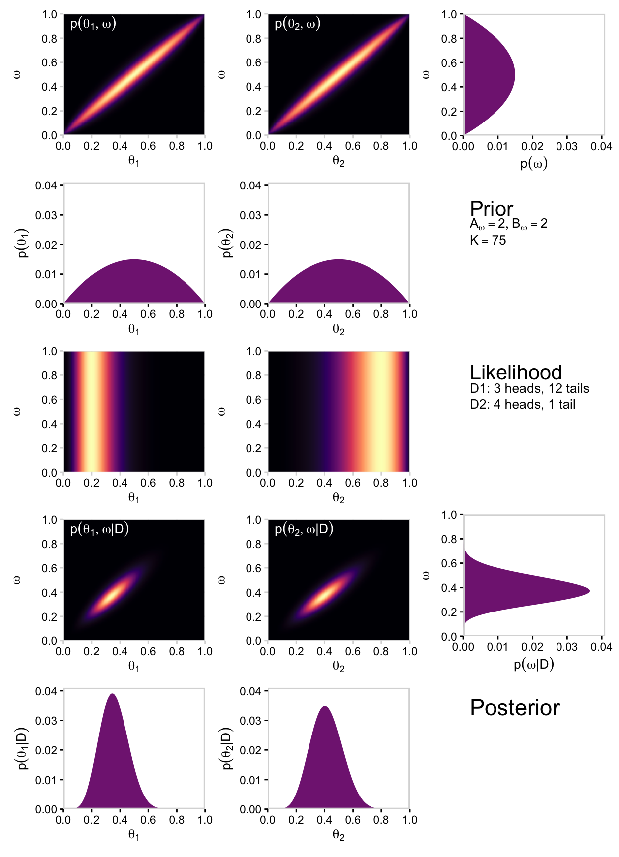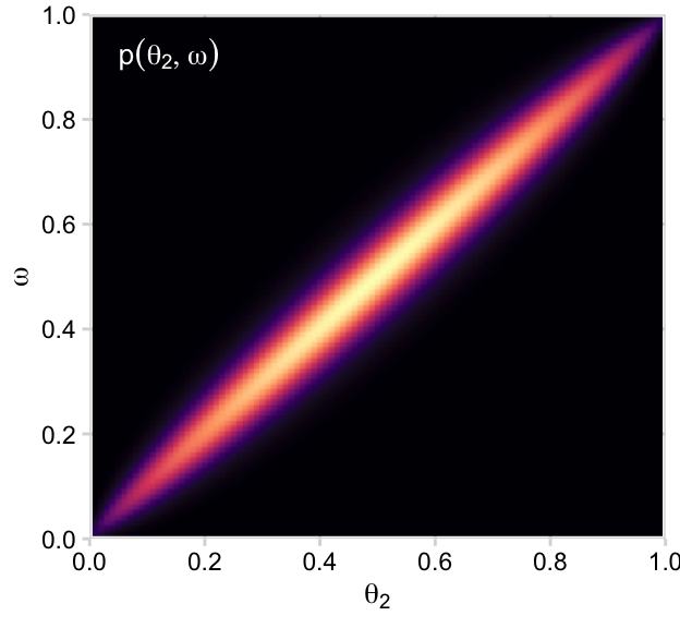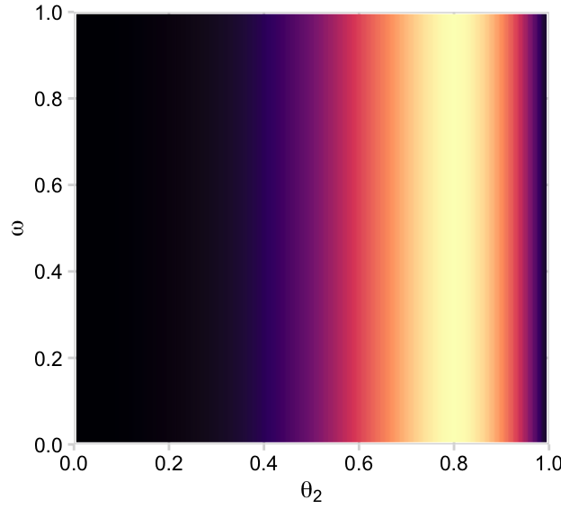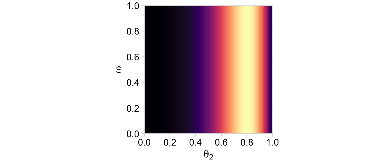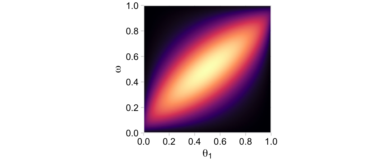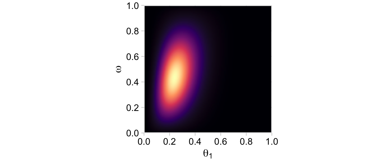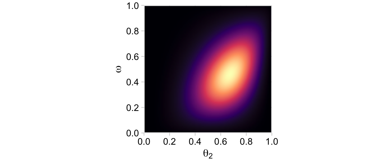 p11 <- d |>group_by(theta_1, omega) |>summarise(prior =sum(prior)) |>ggplot(aes(x = theta_1, y = omega, fill = prior)) +geom_2dd(font_size =10) +annotate(geom ="text", x =0.05, y =0.925, label ="p(list(theta[1], omega))", color ="white", hjust =0, parse =TRUE) +labs(x =expression(theta[1]),y =expression(omega))p12 <- d |>group_by(theta_2, omega) |>summarise(prior =sum(prior)) |>ggplot(aes(x = theta_2, y = omega, fill = prior)) +geom_2dd(font_size =10) +annotate(geom ="text", x =0.05, y =0.925, label ="p(list(theta[2], omega))", color ="white", hjust =0, parse =TRUE) +labs(x =expression(theta[2]),y =expression(omega))p11