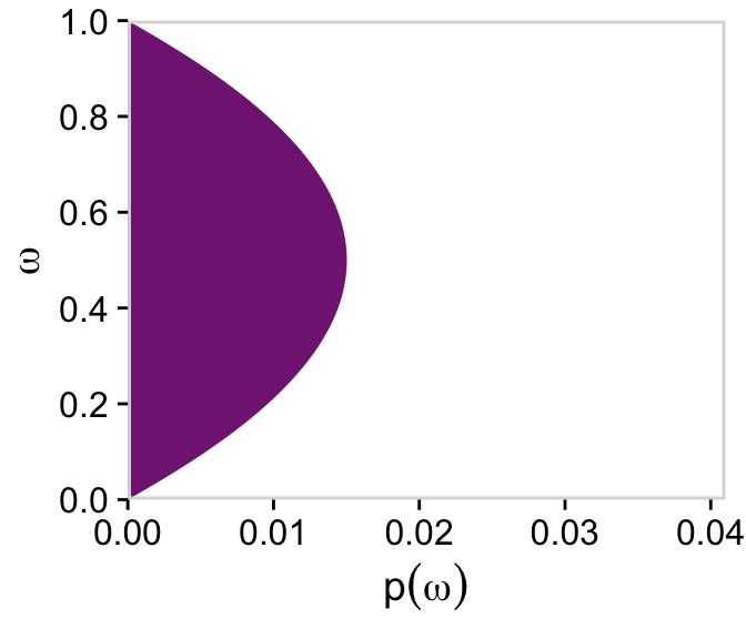 # For omegad |>group_by(omega) |>summarise(prior =sum(prior)) |>ggplot(aes(x = omega, y = prior)) +geom_marginal(ul =0.041) +labs(x =expression(omega),y =expression(p(omega))) +coord_flip()