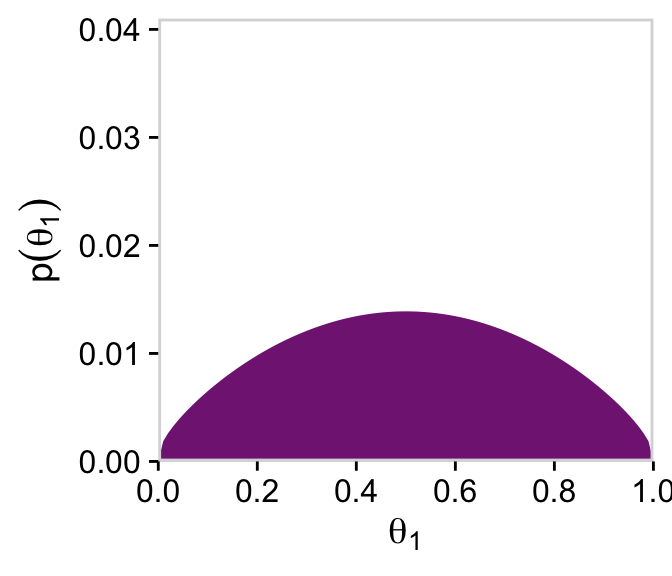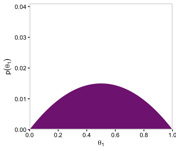 # For thetad |>group_by(theta_1) |>summarise(prior =sum(prior)) |>ggplot(aes(x = theta_1, y = prior)) +geom_marginal(ul =0.041) +labs(x =expression(theta[1]),y =expression(p(theta[1])))