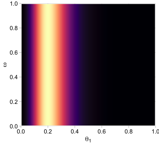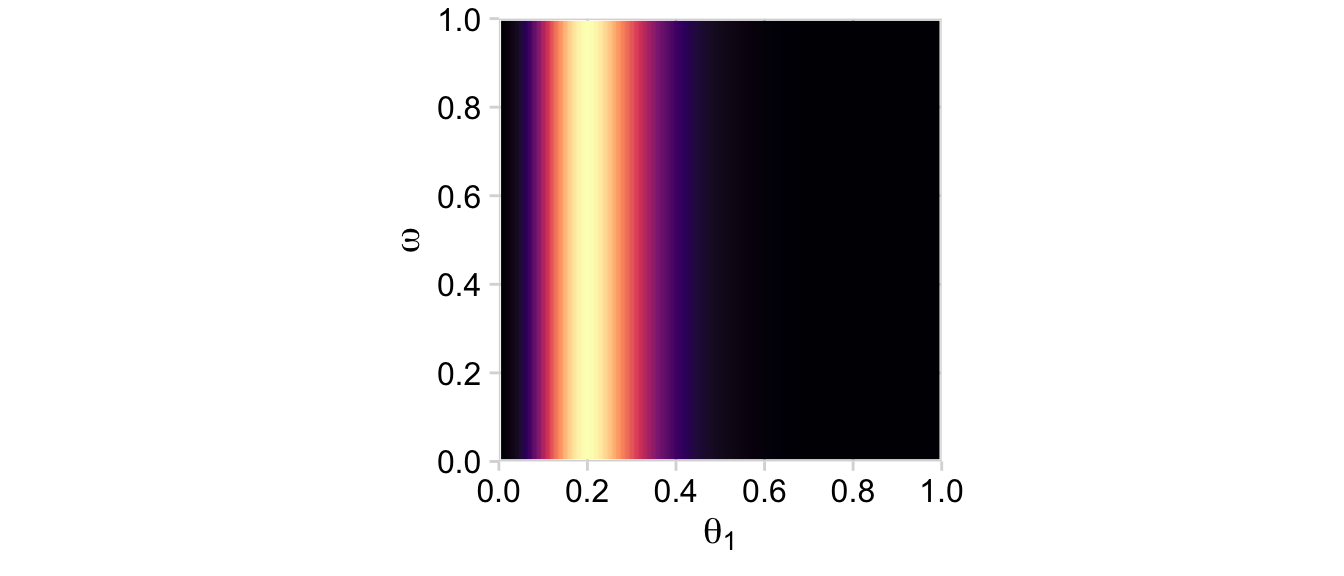 # Computed <- d |>mutate(posterior = (prior * likelihood) /sum(prior * likelihood))# posterior_1d |>group_by(theta_1, omega) |>summarise(posterior =sum(posterior)) |>ggplot(aes(x = theta_1, y = omega, fill = posterior)) +geom_2dd() +labs(x =expression(theta[1]),y =expression(omega))