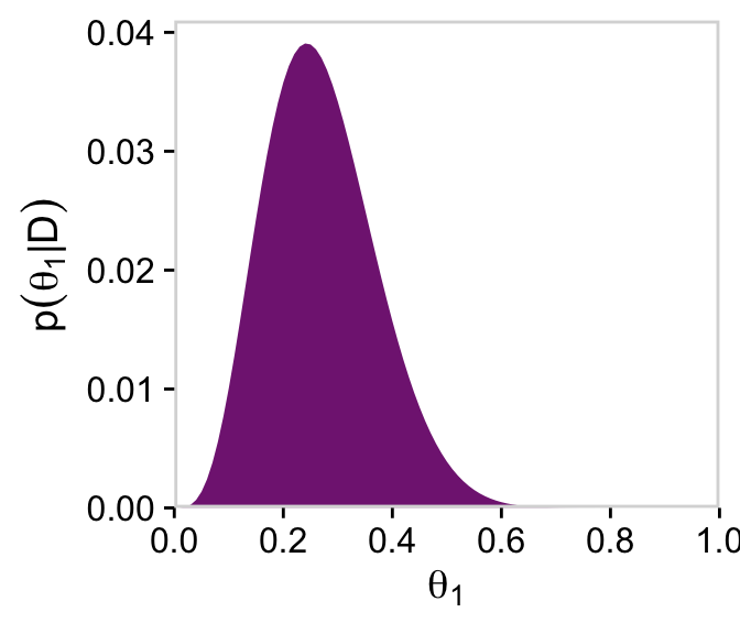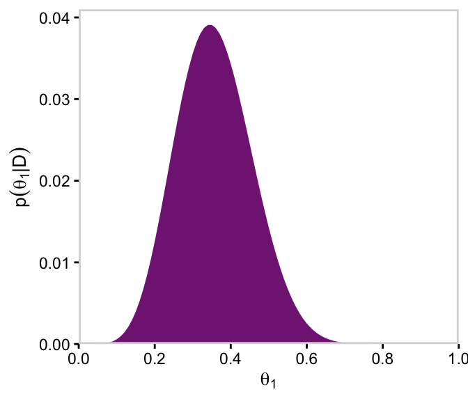 # For theta_1d |>group_by(theta_1) |>summarise(posterior =sum(posterior)) |>ggplot(aes(x = theta_1, y = posterior)) +geom_marginal(ul =0.041) +labs(x =expression(theta[1]),y =expression(p(theta[1]*"|"*D)))