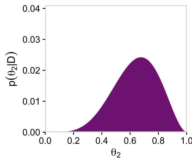 # For theta_2d |>group_by(theta_2) |>summarise(posterior =sum(posterior)) |>ggplot(aes(x = theta_2, y = posterior)) +geom_marginal(ul =0.041) +labs(x =expression(theta[2]),y =expression(p(theta[2]*"|"*D)))