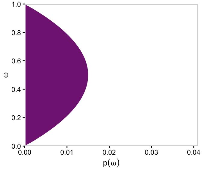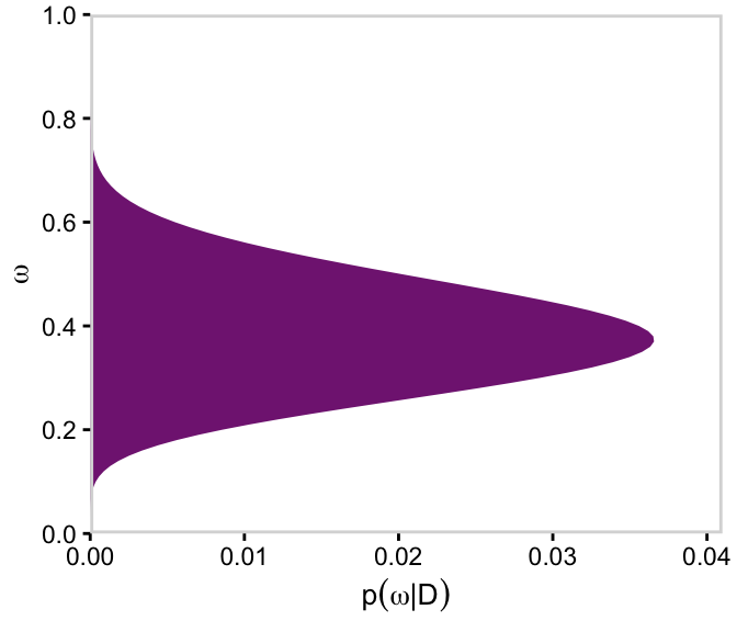 # For omegad |>group_by(omega) |>summarise(posterior =sum(posterior)) |>ggplot(aes(x = omega, y = posterior)) +geom_marginal(ul =0.041) +labs(x =expression(omega),y =expression(p(omega*"|"*D))) +coord_flip()