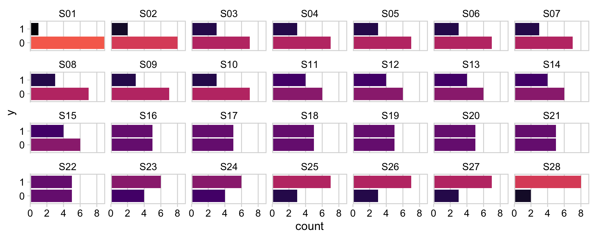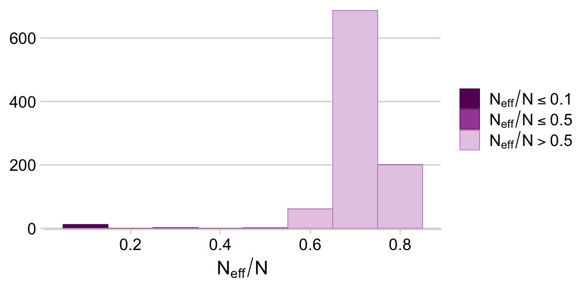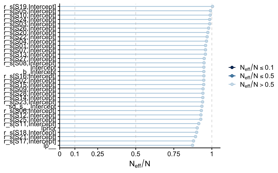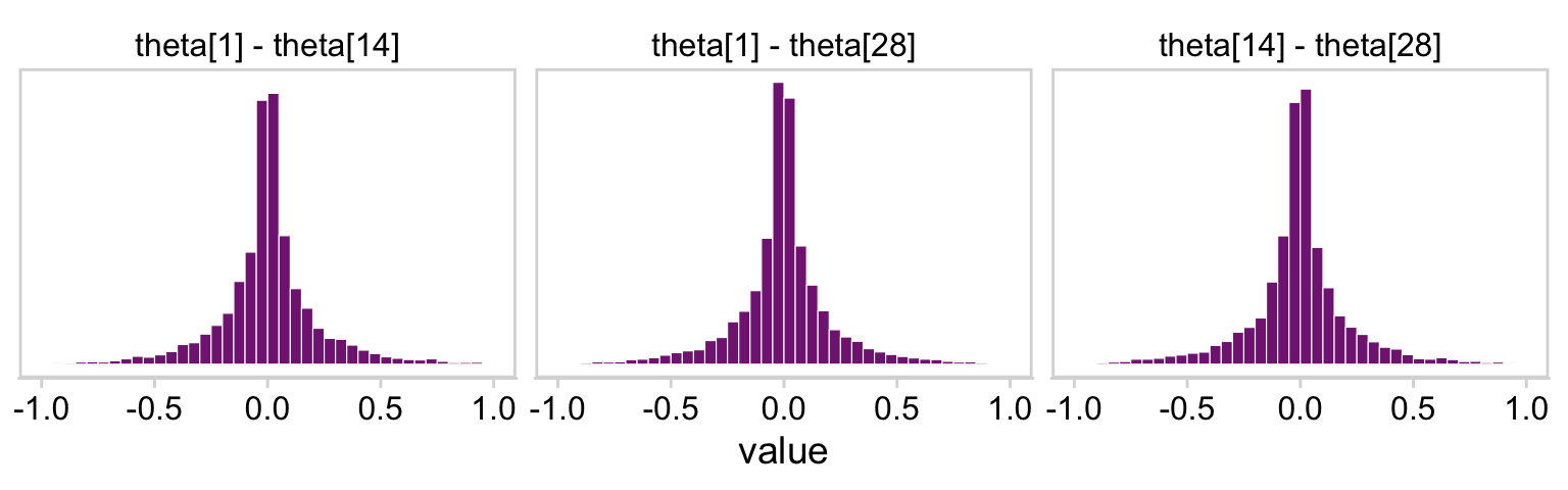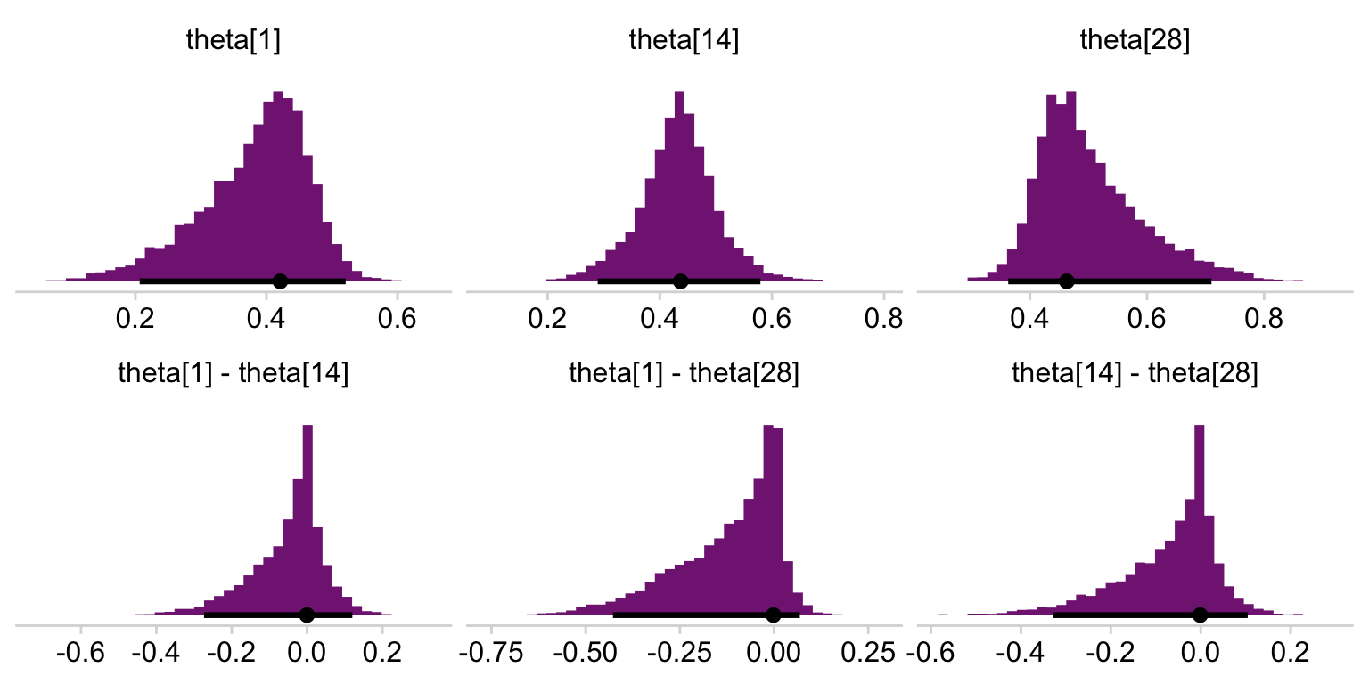 The dots in the \(z/N\) row are the sample statistics. The dots in the \(\theta\) row are the posterior means for each of the levels of s, the grouping variable in the my_data data. You’ll note that we jittered the values for both within the second mutate() line to help reduce the overplotting. If you don’t understand what that means, run the code without that line or set the values within runif() closer to zero. You’ll see. Anyway, for more on multilevel shrinkage and for plots of this kind, check out Efron and Morris’s classic (1977) paper, Stein’s paradox in statistics, and my blog post walking out one of their examples in brms.
