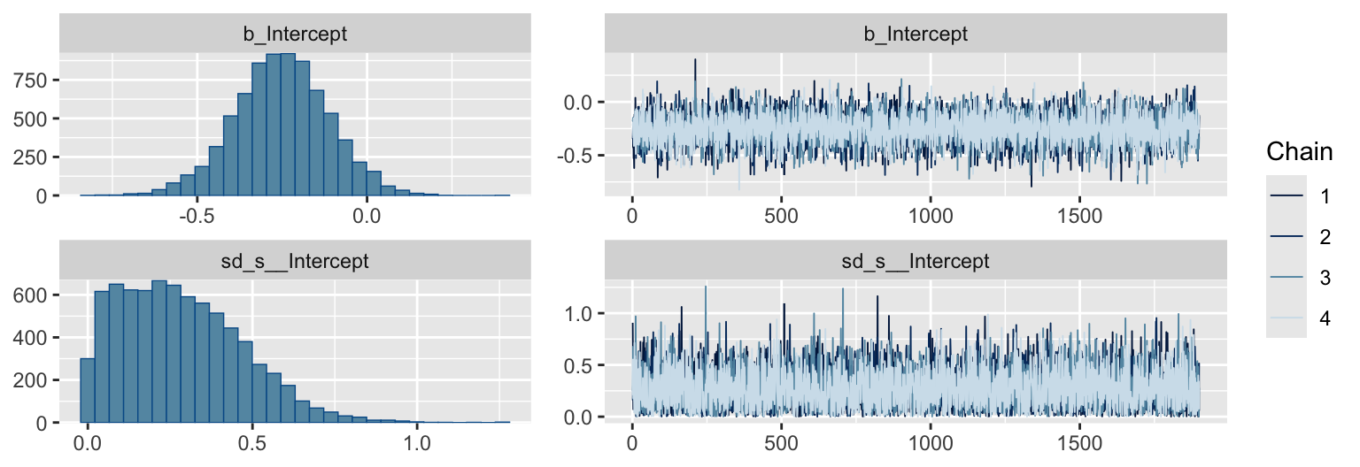 I’m not aware there’s a straight conversion to get \(\sigma\) in a probability metric. As far as I can tell, you have to first use coef() to “extract [the] model coefficients, which are the sum of population-level effects and corresponding group-level effects” (Bürkner, 2022a, p. 58). With the model coefficient draws in hand, you can index them by posterior iteration, group them by that index, compute the iteration-level \(\textit{SD}\)’s, and then plot the distribution of the \(\textit{SD}\)’s.