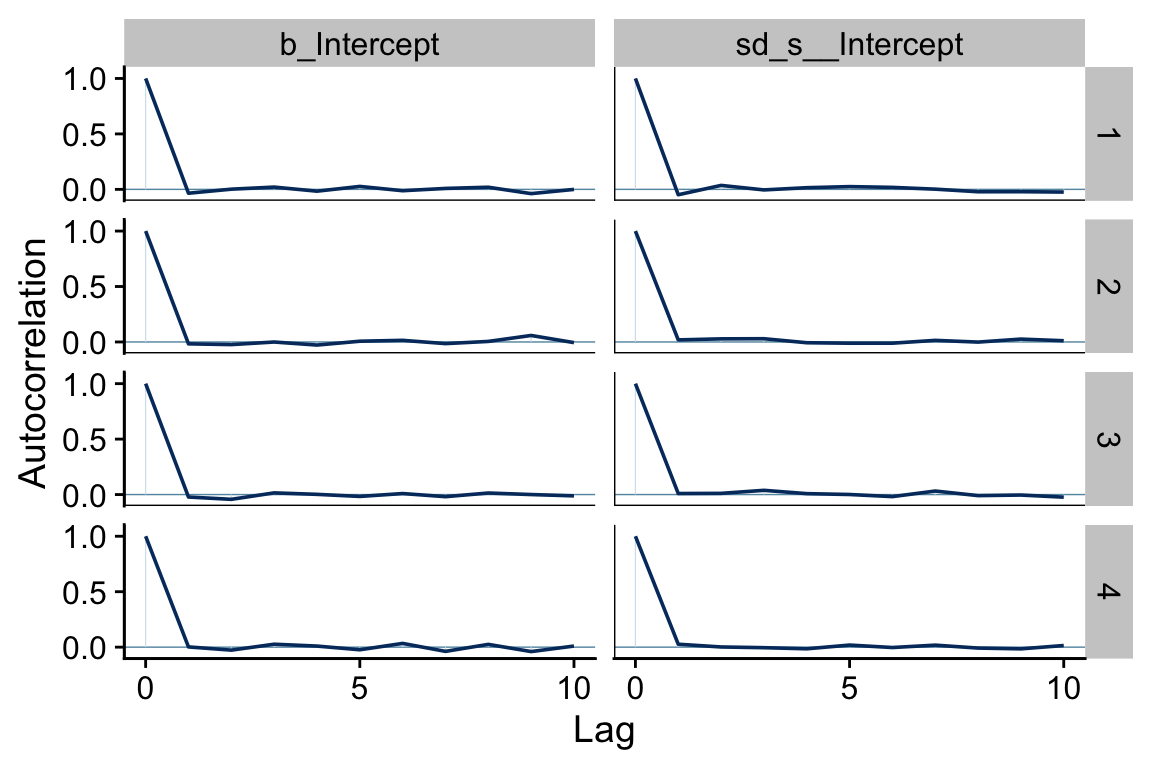 As far as I’m aware, brms offers three major ways to get the group-level parameters for a hierarchical model: using one of the as_draws functions, coef(), or fitted(). We’ll cover each, beginning with as_draws. In order to look at the autocorrelation plots, above, we already saved the results from as_draws_df(fit9.2) as draws. Let’s look at its structure with head().