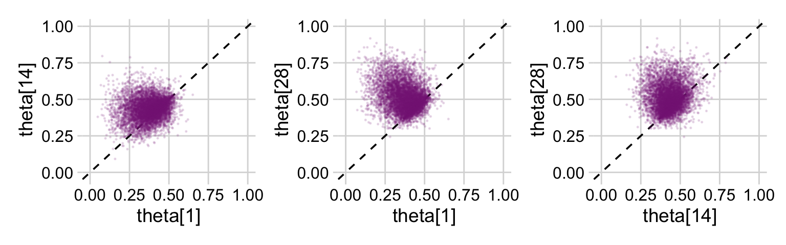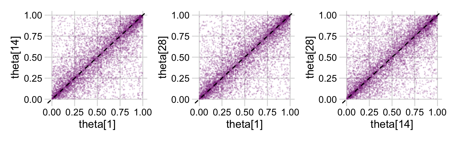 p1 <- draws_small |>ggplot(aes(x =`theta[1]`, y =`theta[14]`)) +geom_abline(linetype =2) +geom_point(alpha =1/8, color = a_purple, size =1/8)p2 <- draws_small |>ggplot(aes(x =`theta[1]`, y =`theta[28]`)) +geom_abline(linetype =2) +geom_point(alpha =1/8, color = a_purple, size =1/8)p3 <- draws_small |>ggplot(aes(x =`theta[14]`, y =`theta[28]`)) +geom_abline(linetype =2) +geom_point(alpha =1/8, color = a_purple, size =1/8)(p1 + p2 + p3) &coord_cartesian(xlim =c(0, 1),ylim =c(0, 1)) &theme_minimal_grid()