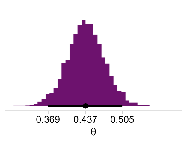 # This part makes it easier to set the break points in `scale_x_continuous()` labels <- draws |>transmute(theta = b_Intercept |>plogis()) |>mode_hdi() |>pivot_longer(cols = theta:.upper) |>mutate(label = value |>round(digits =3) |>as.character())draws |>mutate(theta = b_Intercept |>plogis()) |>ggplot(aes(x = theta, y =0)) +stat_histinterval(point_interval = mode_hdi, .width =0.95,breaks =40, fill = a_purple) +scale_x_continuous(expression(theta), breaks = labels$value,labels = labels$label) +scale_y_continuous(NULL, breaks =NULL) +theme_minimal_hgrid()