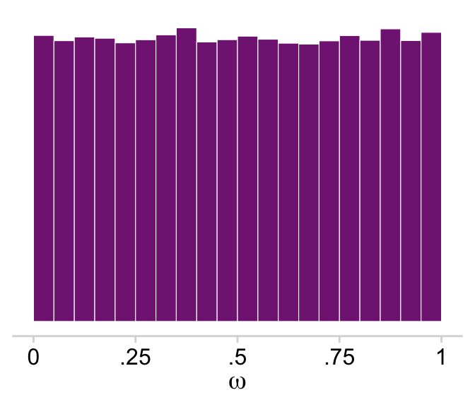 Kruschke used a \(\operatorname{Beta}(1, 1)\) prior for \(\omega\). If you randomly draw from that prior and plot a histogram, you’ll see it was flat.
