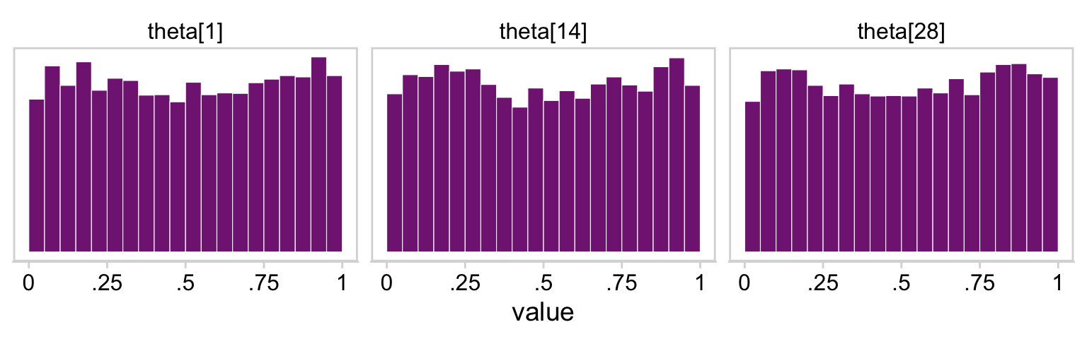 p1 <- prior_draws |>ggplot(aes(x =`theta[1]`, y =`theta[14]`)) +geom_point(alpha =1/8, color = a_purple, size =1/8)p2 <- prior_draws |>ggplot(aes(x =`theta[1]`, y =`theta[28]`)) +geom_point(alpha =1/8, color = a_purple, size =1/8)p3 <- prior_draws |>ggplot(aes(x =`theta[14]`, y =`theta[28]`)) +geom_point(alpha =1/8, color = a_purple, size =1/8)(p1 + p2 + p3) &geom_abline(linetype =2) &coord_cartesian(xlim =c(0, 1),ylim =c(0, 1)) &theme_minimal_grid()