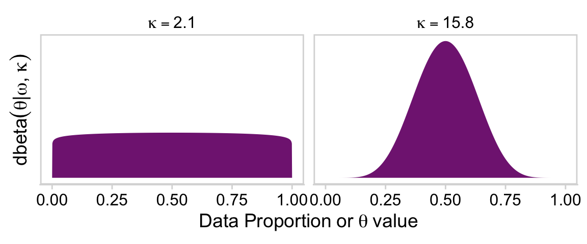 Though we will be fitting a hierarchical model with subjects \(s\) within categories \(c\), the higher-level parameters will not be \(\omega\) and \(\kappa\). As we’ll go over, below, we will use the binomial distribution within a more conventional hierarchical logistic regression paradigm. In this paradigm, we have an overall intercept, often called \(\alpha\) or \(\beta_0\), which will be our analogue to Kruschke’s overall \(\omega\). For the two grouping categories, \(s\) and \(c\), we will have \(\sigma\) estimates, which express the variability within those grouping. You’ll see when we get there.
