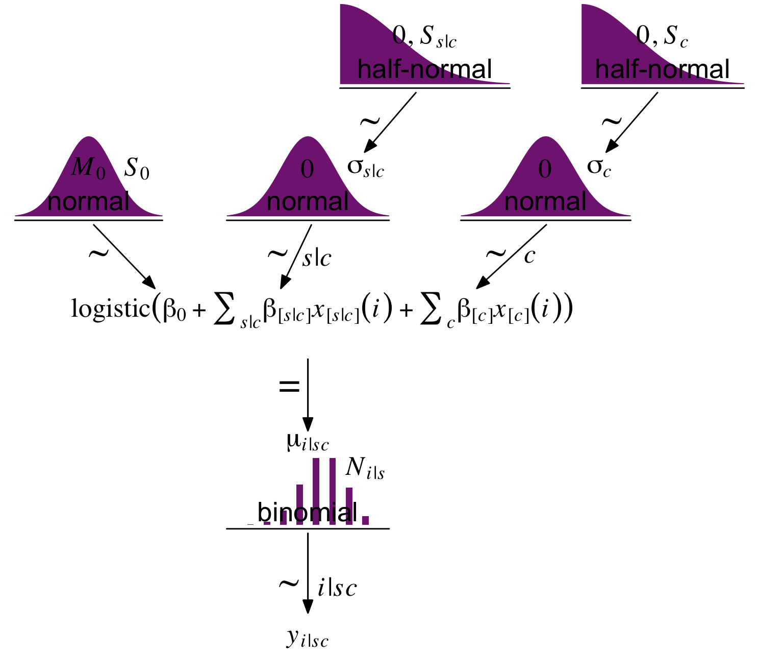 # Half-normal densityp1 <-tibble(x =seq(from =0, to =3, by =0.01)) |>ggplot(aes(x = x, y = (dnorm(x)) /max(dnorm(x)))) +geom_area(fill = a_purple) +annotate(geom ="text",x =1.5, y =0.2,label ="half-normal",size =7) +annotate(geom ="text",x =1.5, y =0.6,label ="0*','*~italic(S)[italic(s)*'|'*italic(c)]", family ="Times", parse =TRUE, size =7) +scale_x_continuous(expand =c(0, 0)) +theme_void() +theme(axis.line.x =element_line(linewidth =0.5))# Second half-normal densityp2 <-tibble(x =seq(from =0, to =3, by =0.01)) |>ggplot(aes(x = x, y = (dnorm(x)) /max(dnorm(x)))) +geom_area(fill = a_purple) +annotate(geom ="text",x =1.5, y =0.2,label ="half-normal",size =7) +annotate(geom ="text",x =1.5, y =0.6,label ="0*','*~italic(S)[italic(c)]", family ="Times", parse =TRUE, size =7) +scale_x_continuous(expand =c(0, 0)) +theme_void() +theme(axis.line.x =element_line(linewidth =0.5))# Annotated arrowp3 <-tibble(x =0.85,y =1,xend =0.5,yend =0.25) |>ggplot(aes(x = x, xend = xend,y = y, yend = yend)) +geom_segment(arrow = my_arrow) +annotate(geom ="text",x =0.54, y =0.6, label ="'~'", family ="Times", parse =TRUE, size =10) +xlim(0, 1) +theme_void()# Normal densityp4 <-tibble(x =seq(from =-3, to =3, by =0.1)) |>ggplot(aes(x = x, y = (dnorm(x)) /max(dnorm(x)))) +geom_area(fill = a_purple) +annotate(geom ="text",x =0, y =0.2,label ="normal",size =7) +annotate(geom ="text",x =c(0, 1.45), y =0.6,hjust =c(0.5, 0),label =c("italic(M)[0]", "italic(S)[0]"), family ="Times", parse =TRUE, size =7) +scale_x_continuous(expand =c(0, 0)) +theme_void() +theme(axis.line.x =element_line(linewidth =0.5))# Second normal densityp5 <-tibble(x =seq(from =-3, to =3, by =0.1)) |>ggplot(aes(x = x, y = (dnorm(x)) /max(dnorm(x)))) +geom_area(fill = a_purple,) +annotate(geom ="text",x =0, y =0.2,label ="normal",size =7) +annotate(geom ="text",x =c(0, 1.45), y =0.6,hjust =c(.5, 0),label =c("0", "sigma[italic(s)*'|'*italic(c)]"), family ="Times", parse =TRUE, size =7) +scale_x_continuous(expand =c(0, 0)) +theme_void() +theme(axis.line.x =element_line(linewidth =0.5))# Third normal densityp6 <-tibble(x =seq(from =-3, to =3, by =0.1)) |>ggplot(aes(x = x, y = (dnorm(x)) /max(dnorm(x)))) +geom_area(fill = a_purple) +annotate(geom ="text",x =0, y =0.2,label ="normal",size =7) +annotate(geom ="text",x =c(0, 1.45), y =0.6,hjust =c(0.5, 0),label =c("0", "sigma[italic(c)]"), family ="Times", parse =TRUE, size =7) +scale_x_continuous(expand =c(0, 0)) +theme_void() +theme(axis.line.x =element_line(linewidth =0.5))# Three annotated arrowsp7 <-tibble(x =c(0.09, 0.48, 0.9),y =1,xend =c(0.2, 0.425, 0.775),yend =0.2) |>ggplot(aes(x = x, xend = xend,y = y, yend = yend)) +geom_segment(arrow = my_arrow) +annotate(geom ="text",x =c(0.10, 0.42, 0.49, 0.81, 0.87), y =0.6,label =c("'~'", "'~'", "italic(s)*'|'*italic(c)", "'~'", "italic(c)"), family ="Times", parse =TRUE, size =c(10, 10, 7, 10, 7)) +xlim(0, 1) +theme_void()# Likelihood formulap8 <-tibble(x =0.5,y =0.5,label ="logistic(beta[0]+sum()[italic(s)*'|'*italic(c)]*beta['['*italic(s)*'|'*italic(c)*']']*italic(x)['['*italic(s)*'|'*italic(c)*']'](italic(i))+sum()[italic(c)]*beta['['*italic(c)*']']*italic(x)['['*italic(c)*']'](italic(i)))") |>ggplot(aes(x = x, y = y, label = label)) +geom_text(family ="Times", parse =TRUE, size =7) +scale_x_continuous(expand =c(0, 0), limits =c(0, 1)) +ylim(0, 1) +theme_void()# A second annotated arrowp9 <-tibble(x =c(0.375, 0.5),y =c(0.75, 0.3),label =c("'='", "mu[italic(i)*'|'*italic(sc)]")) |>ggplot(aes(x = x, y = y, label = label)) +geom_text(family ="Times", parse =TRUE, size =c(10, 7)) +geom_segment(x =0.5, xend =0.5,y =1, yend =0.4,arrow = my_arrow) +xlim(0, 1) +theme_void()# Binomial densityp10 <-tibble(x =0:7) |>ggplot(aes(x = x, y = (dbinom(x, size =7, prob =0.625)) /max(dbinom(x, size =7, prob =0.625)))) +geom_col(fill = a_purple, width =0.4) +annotate(geom ="text",x =3.5, y =0.2,label ="binomial",size =7) +annotate(geom ="text",x =7, y =0.85,label ="italic(N)[italic(i)*'|'*italic(s)]",family ="Times", parse =TRUE, size =7) +coord_cartesian(xlim =c(-1, 8),ylim =c(0, 1.2)) +theme_void() +theme(axis.line.x =element_line(linewidth =0.5))# Another annotated arrowp11 <-tibble(x =c(0.375, 0.7),y =c(1/3, 1/3),label =c("'~'", "italic(i)*'|'*italic(sc)")) |>ggplot(aes(x = x, y = y, label = label)) +geom_text(family ="Times", parse =TRUE, size =c(10, 7)) +geom_segment(x =0.5, xend =0.5,y =1, yend =0,arrow = my_arrow) +xlim(0, 1) +theme_void()# Some textp12 <-tibble(x =1,y =0.5,label ="italic(y)[italic(i)*'|'*italic(sc)]") |>ggplot(aes(x = x, y = y, label = label)) +geom_text(family ="Times", parse =TRUE, size =7) +xlim(0, 2) +theme_void()# Define the layoutlayout <-c(area(t =1, b =2, l =7, r =9),area(t =1, b =2, l =11, r =13),area(t =4, b =5, l =1, r =3),area(t =4, b =5, l =5, r =7),area(t =4, b =5, l =9, r =11),area(t =3, b =4, l =6, r =8),area(t =3, b =4, l =10, r =12),area(t =7, b =8, l =1, r =11),area(t =6, b =7, l =1, r =11),area(t =11, b =12, l =5, r =7),area(t =9, b =11, l =5, r =7),area(t =13, b =14, l =5, r =7),area(t =15, b =15, l =5, r =7))# Combine and plot!(p1 + p2 + p4 + p5 + p6 + p3 + p3 + p8 + p7 + p10 + p9 + p11 + p12) +plot_layout(design = layout) &ylim(0, 1) &theme(plot.margin =margin(0, 5.5, 0, 5.5))