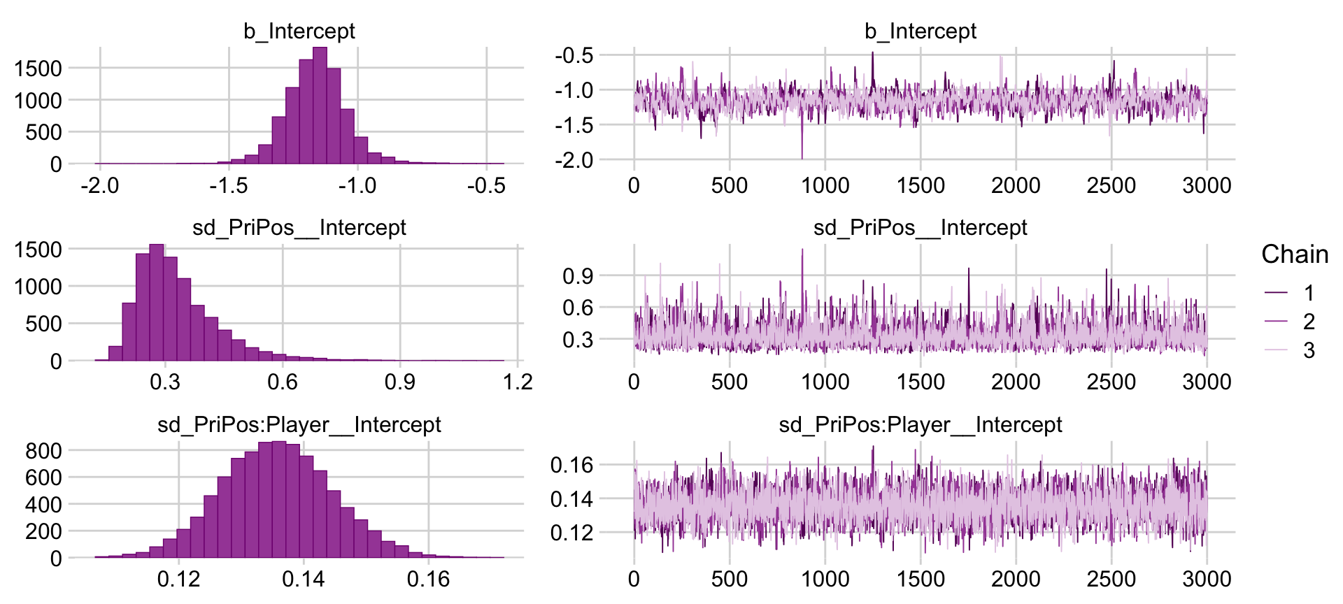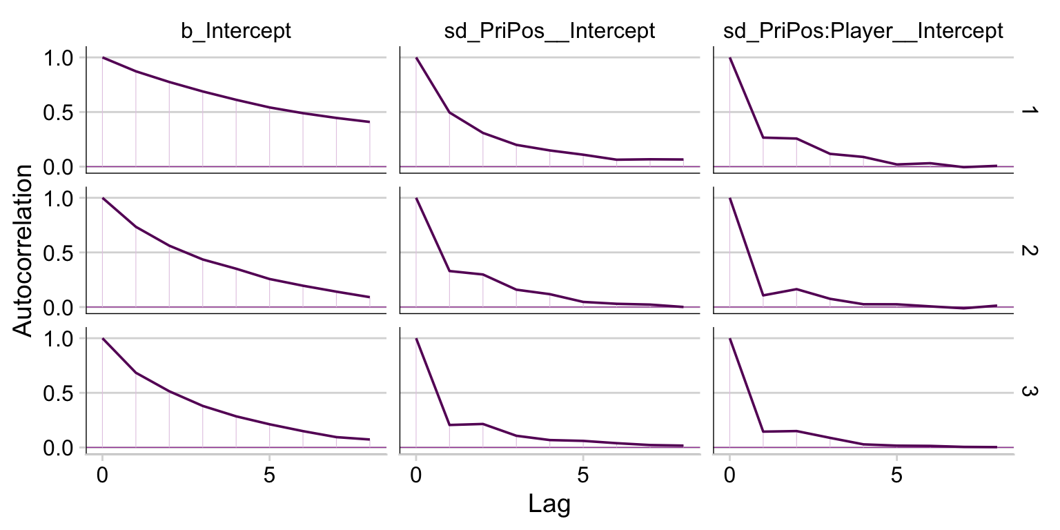 Also note the (1 | PriPos) + (1 | PriPos:Player) syntax. In this model, we have two grouping factors, PriPos and Player. Thus we have two (|) arguments. But since players are themselves nested within positions, we have encoded that nesting with the (1 | PriPos:Player) syntax. For more on this style of syntax, see Kristoffer Magnusson’s handy blog post, Using R and lme/lmer to fit different two- and three-level longitudinal models. Since brms syntax is based on that from the earlier lme4 package, the basic syntax rules apply. Bürkner (2022a), of course, also covered these topics in the brmsformula subsection of the brms reference manual.