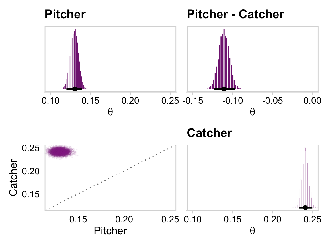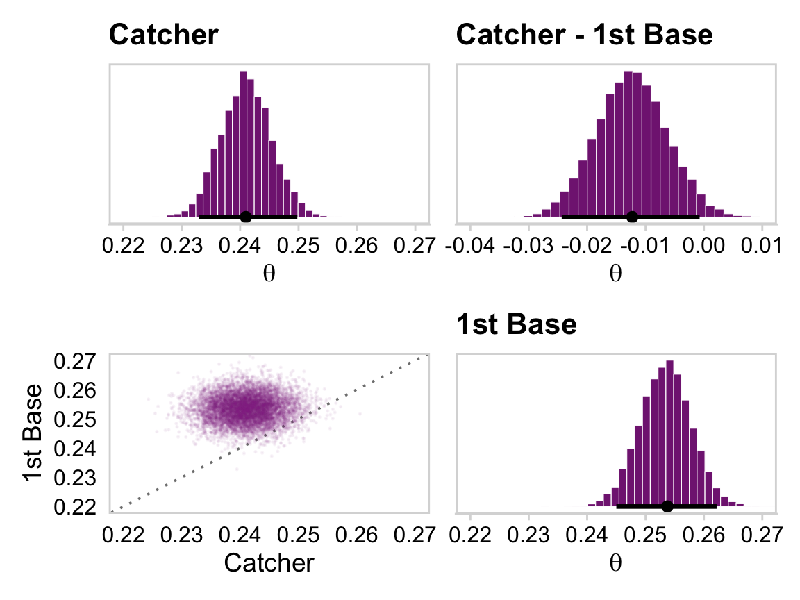 coef_small <- coef_primary_position |>select(`1st Base.Intercept`, Catcher.Intercept, Pitcher.Intercept) |>transmute(`1st Base`=`1st Base.Intercept`, Catcher = Catcher.Intercept, Pitcher = Pitcher.Intercept) |>mutate_all(.funs = plogis) |># Here we make the difference distributionsmutate(`Pitcher - Catcher`= Pitcher - Catcher,`Catcher - 1st Base`= Catcher -`1st Base`)head(coef_small)